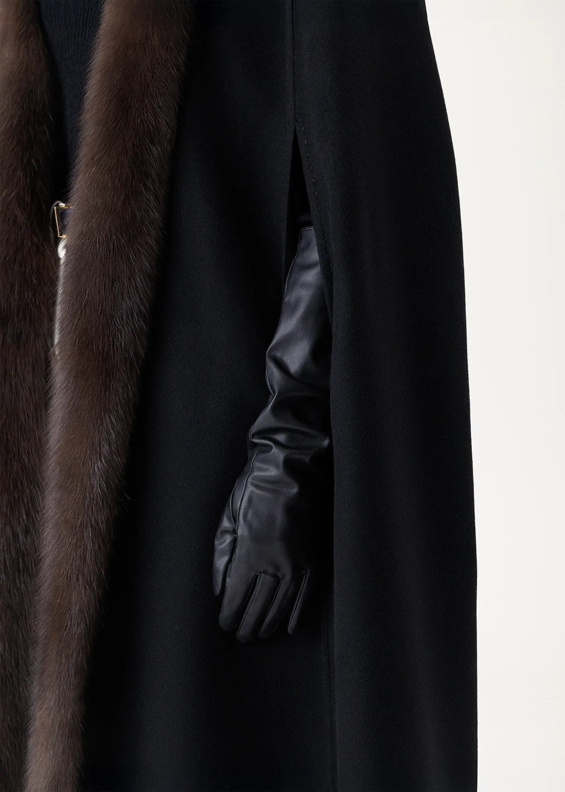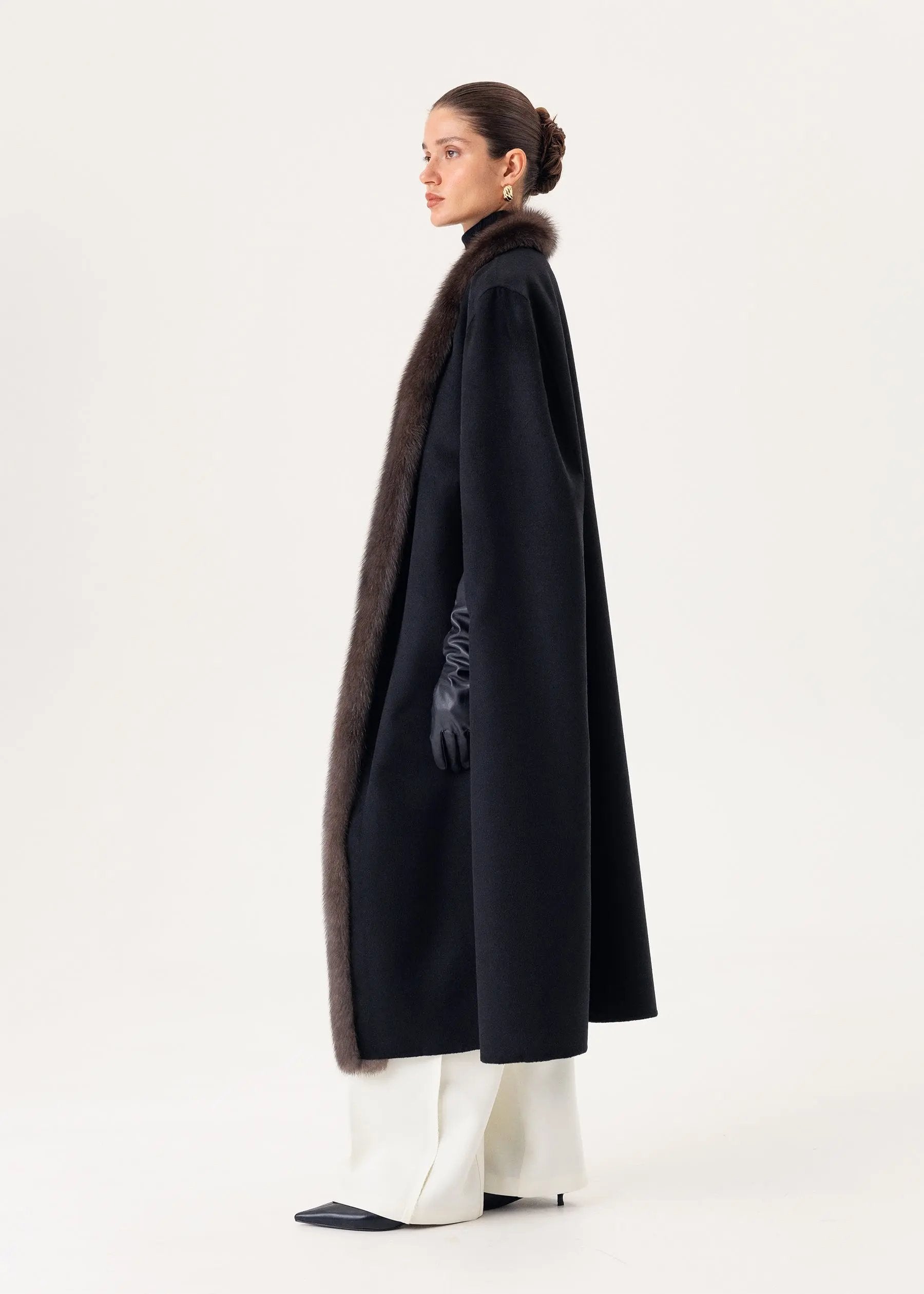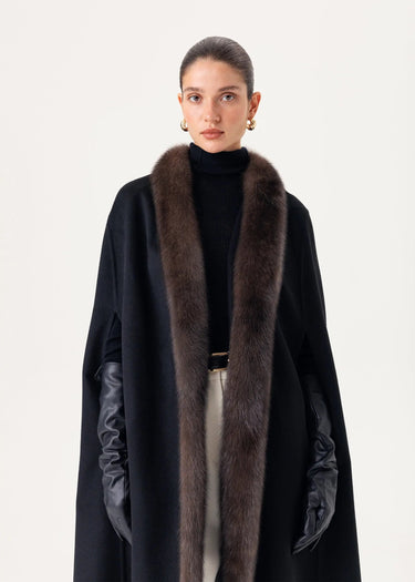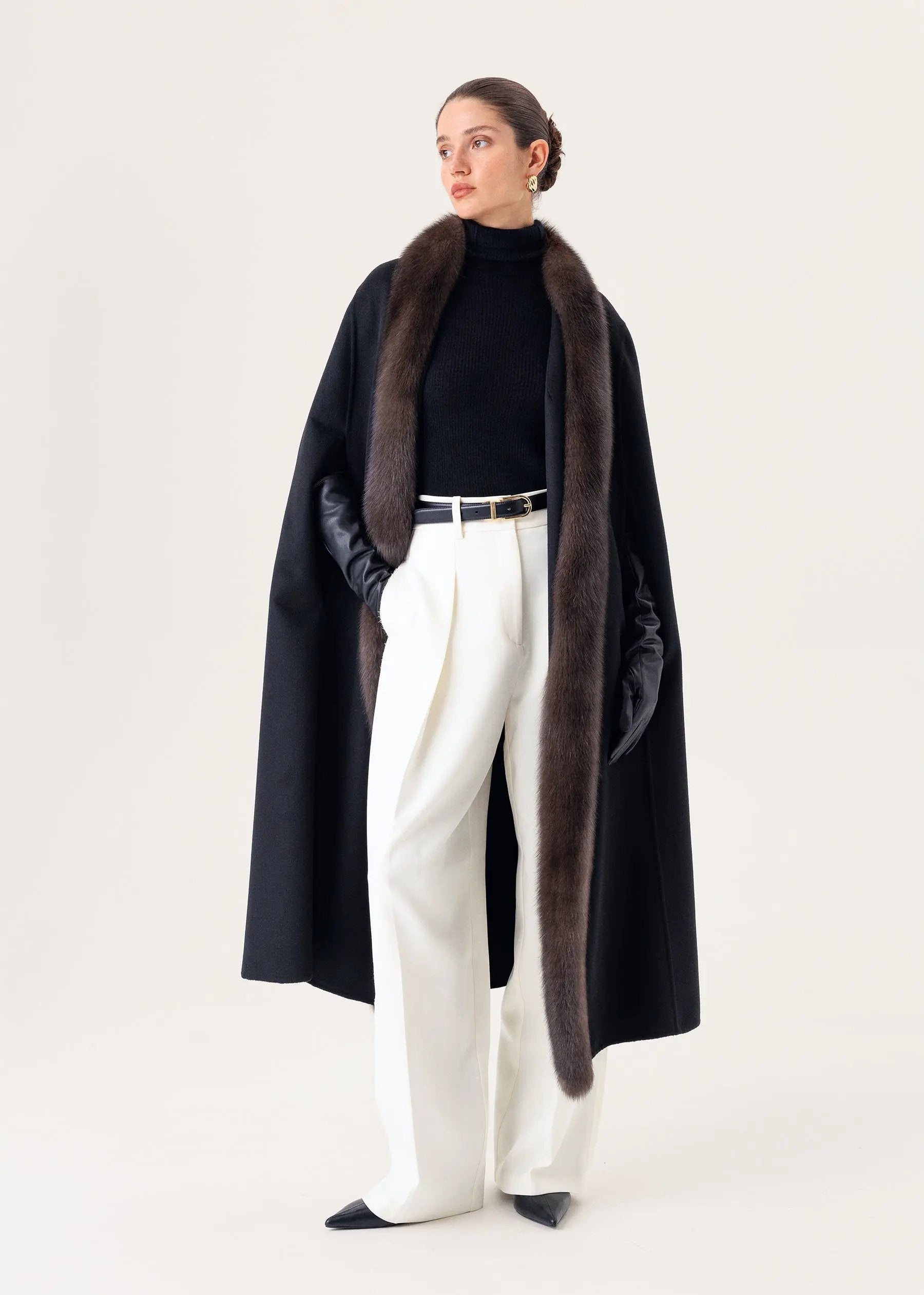 The cashmere cape in a deep, elegant shade is decorated with precious sable fur.