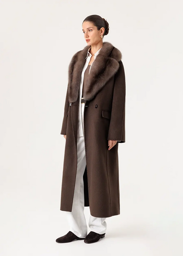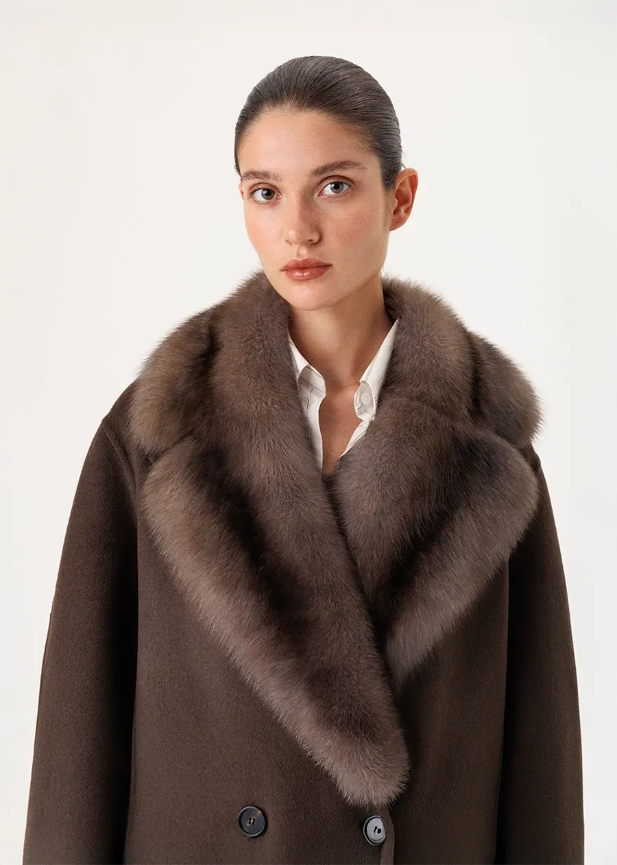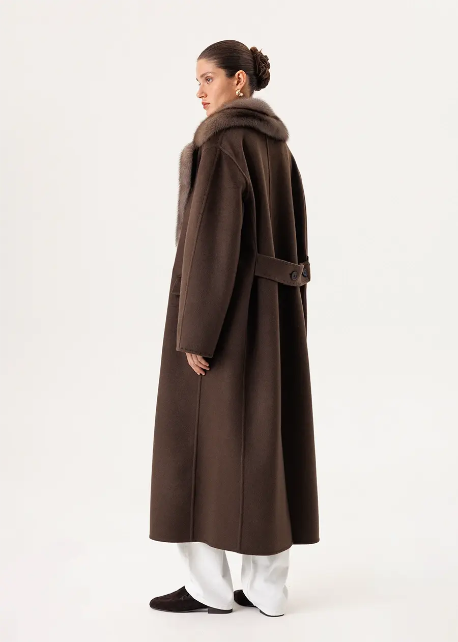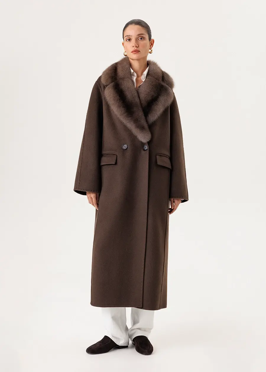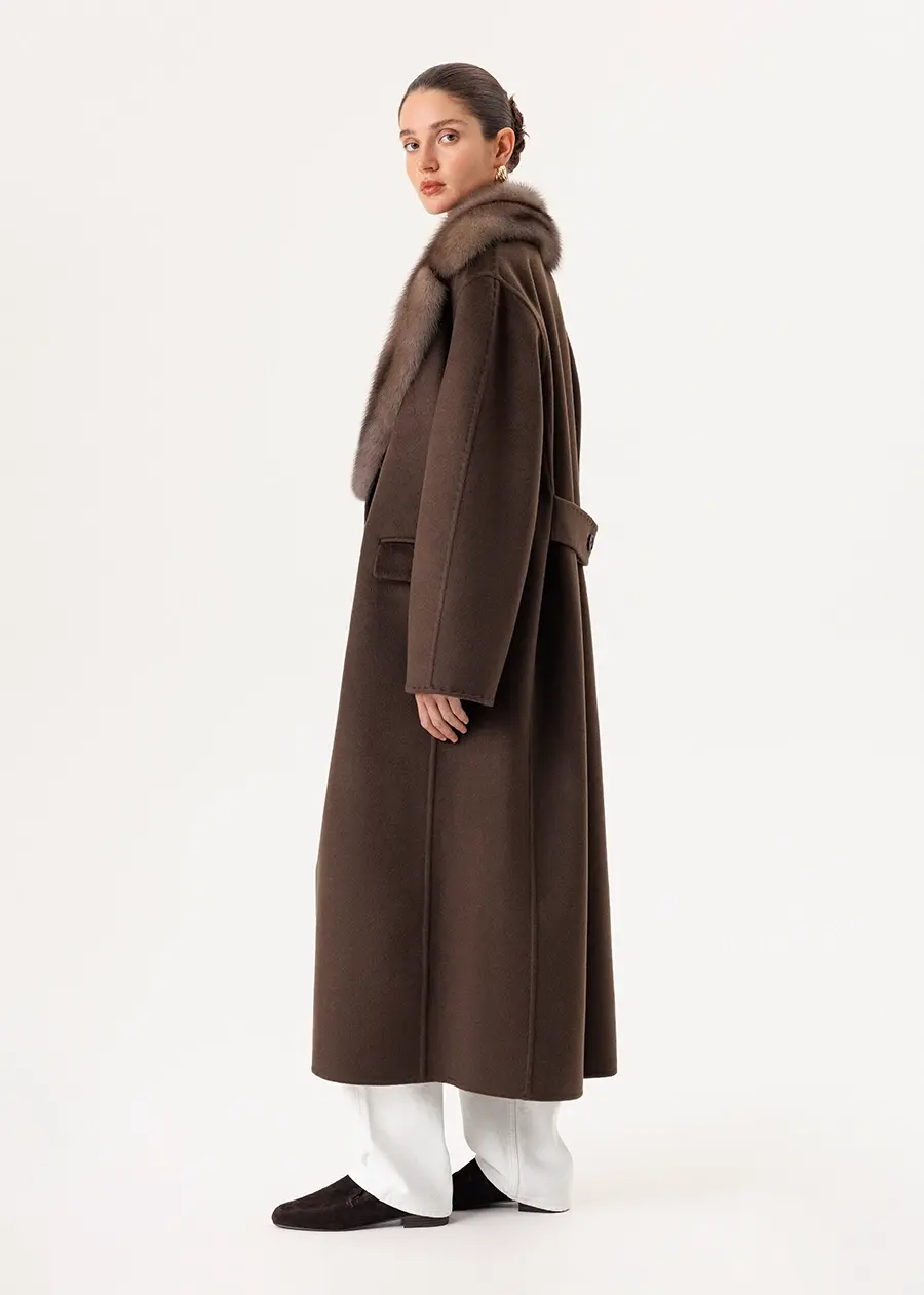 Double-breasted cashmere coat in a deep brown tone with a full English collar and flap pockets.