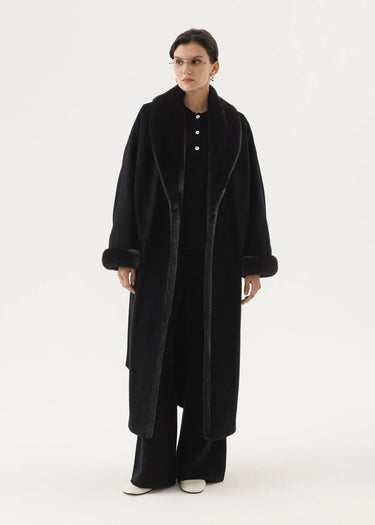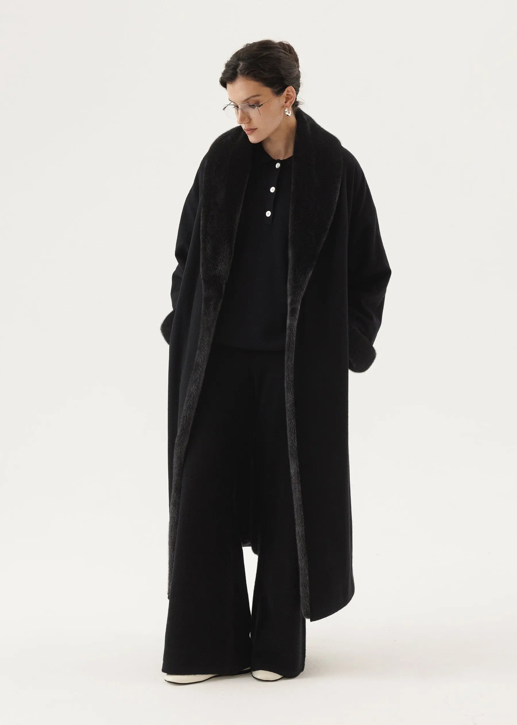 Classic cashmere coat with elegant shawl collar and mink fur lining.