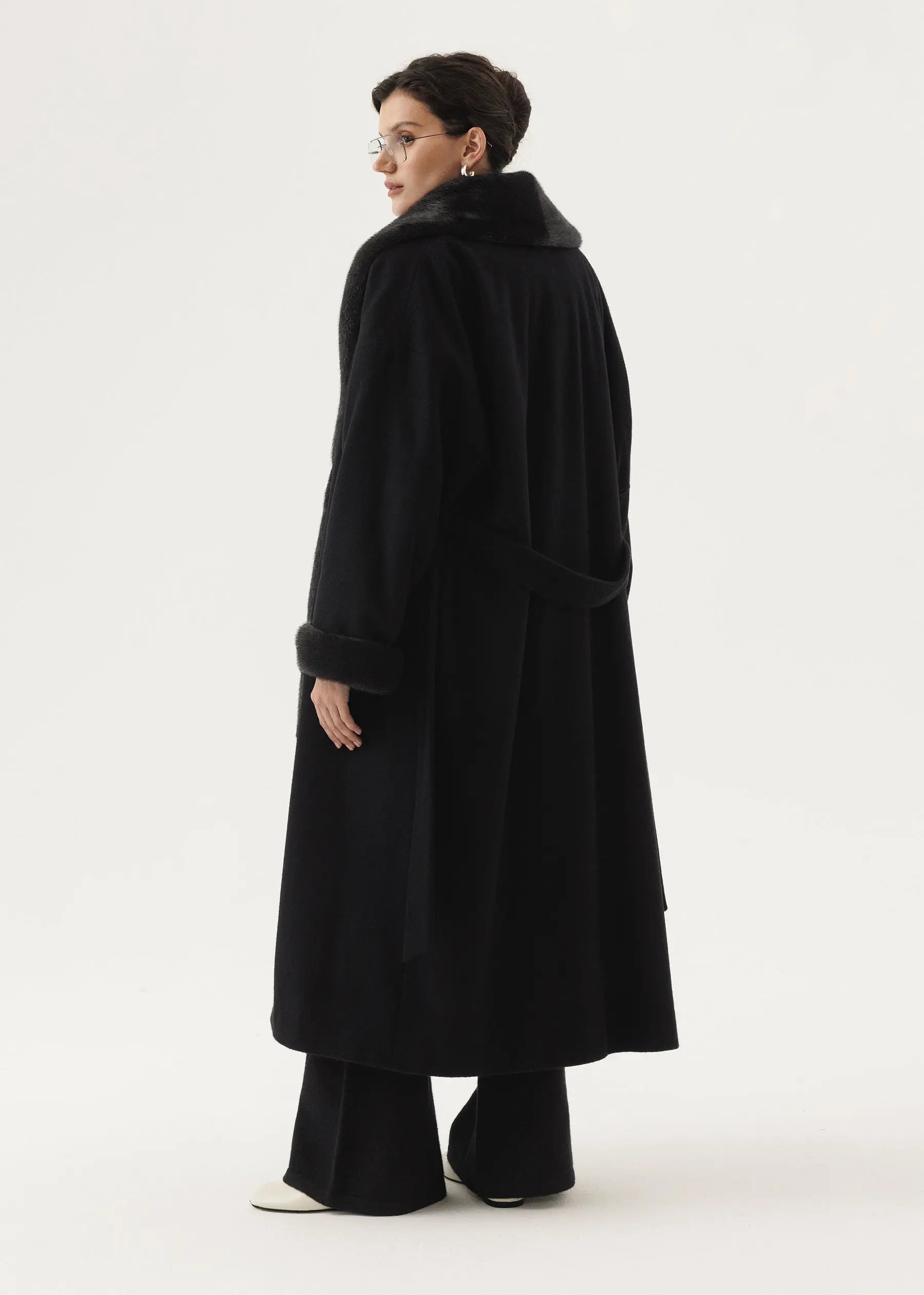 The coat is completed by spectacular cuffs with mink fur lapels, invisible magnetic closures, cozy side pockets and a wide cashmere belt.