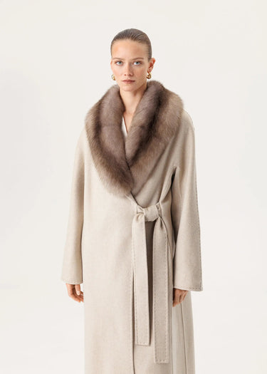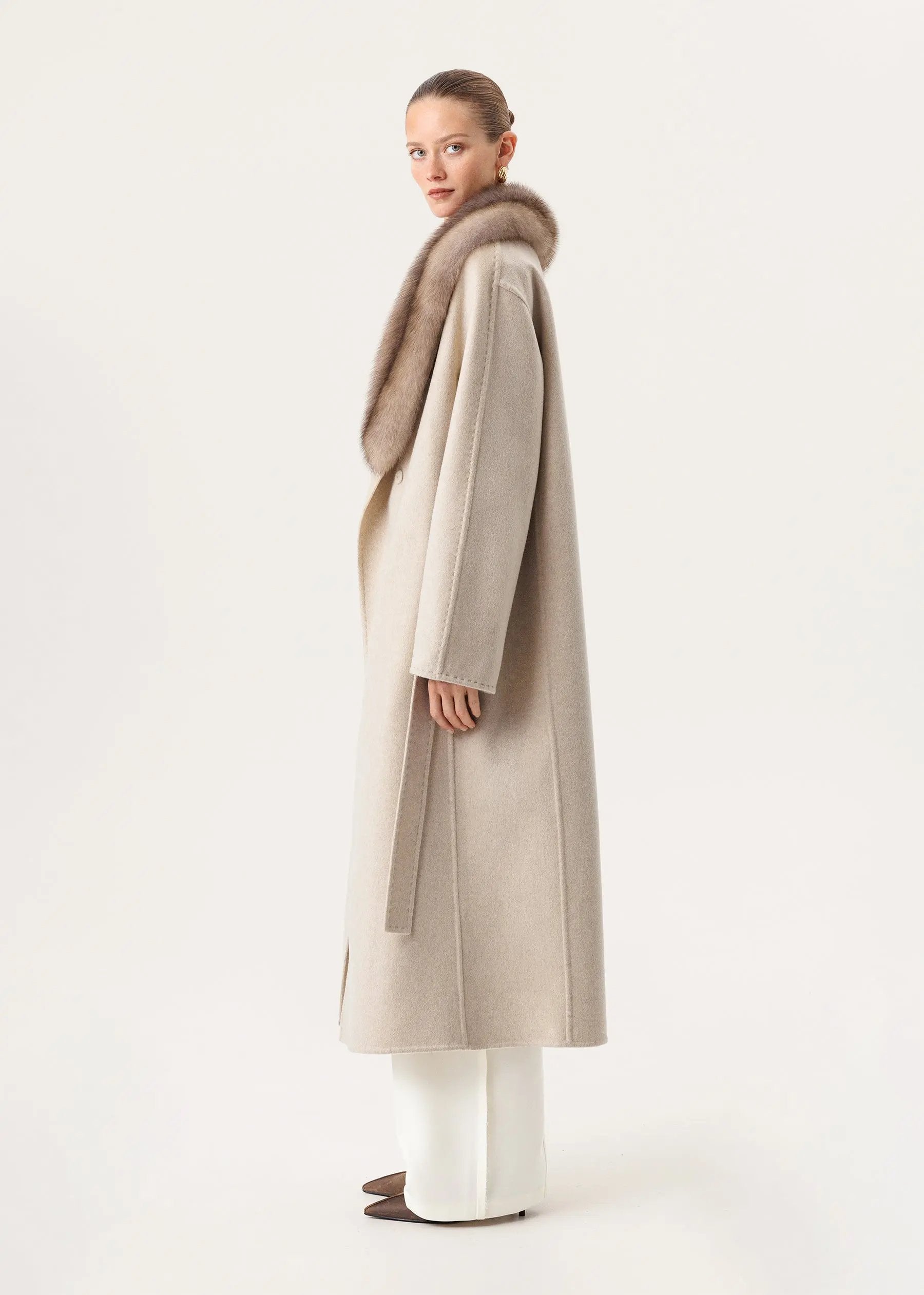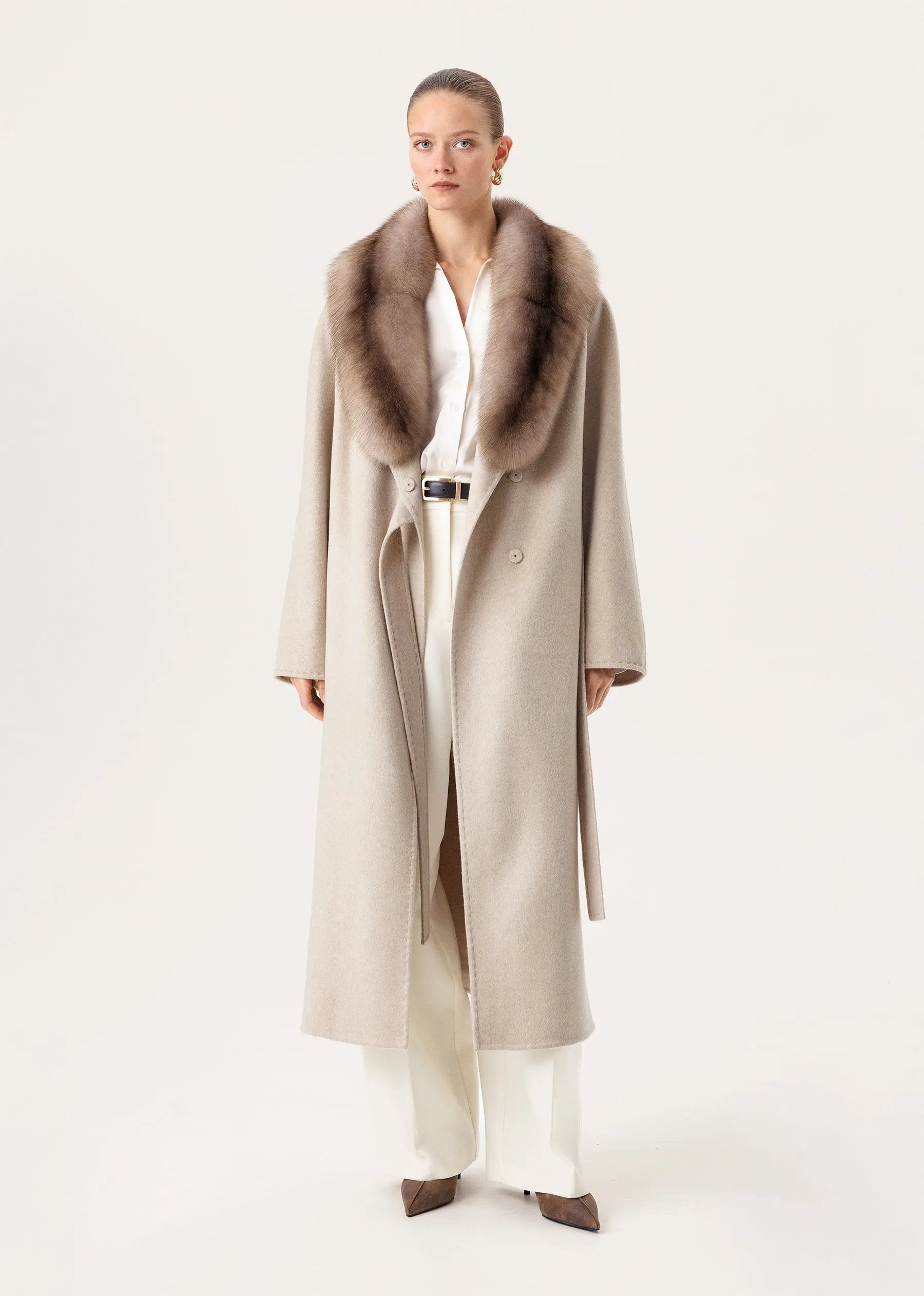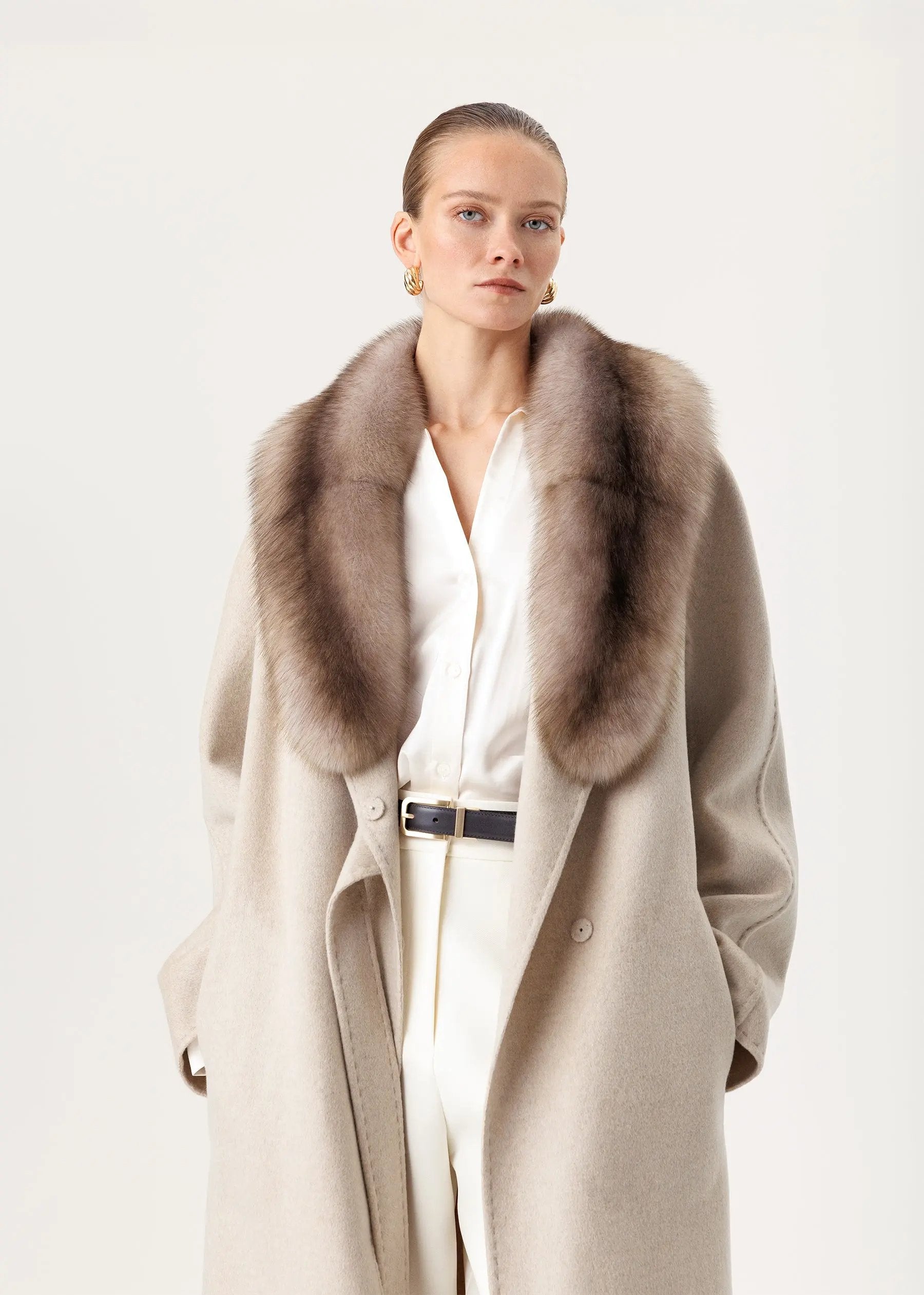 The sewn-in belt and soft lines add femininity to the silhouette, while the sable collar adds a touch of sophistication and status to the look.