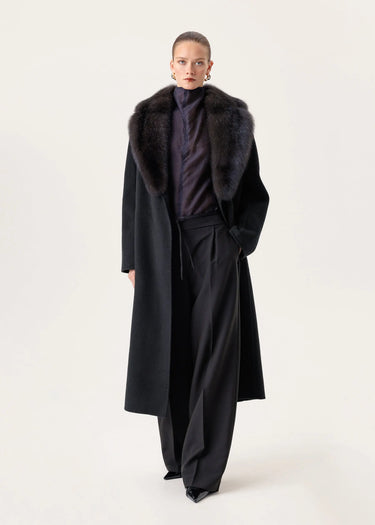 The cashmere coat is comfortable, straight cut and robe-like with a matching belt that perfectly accentuates your waist and cozy welt pockets.