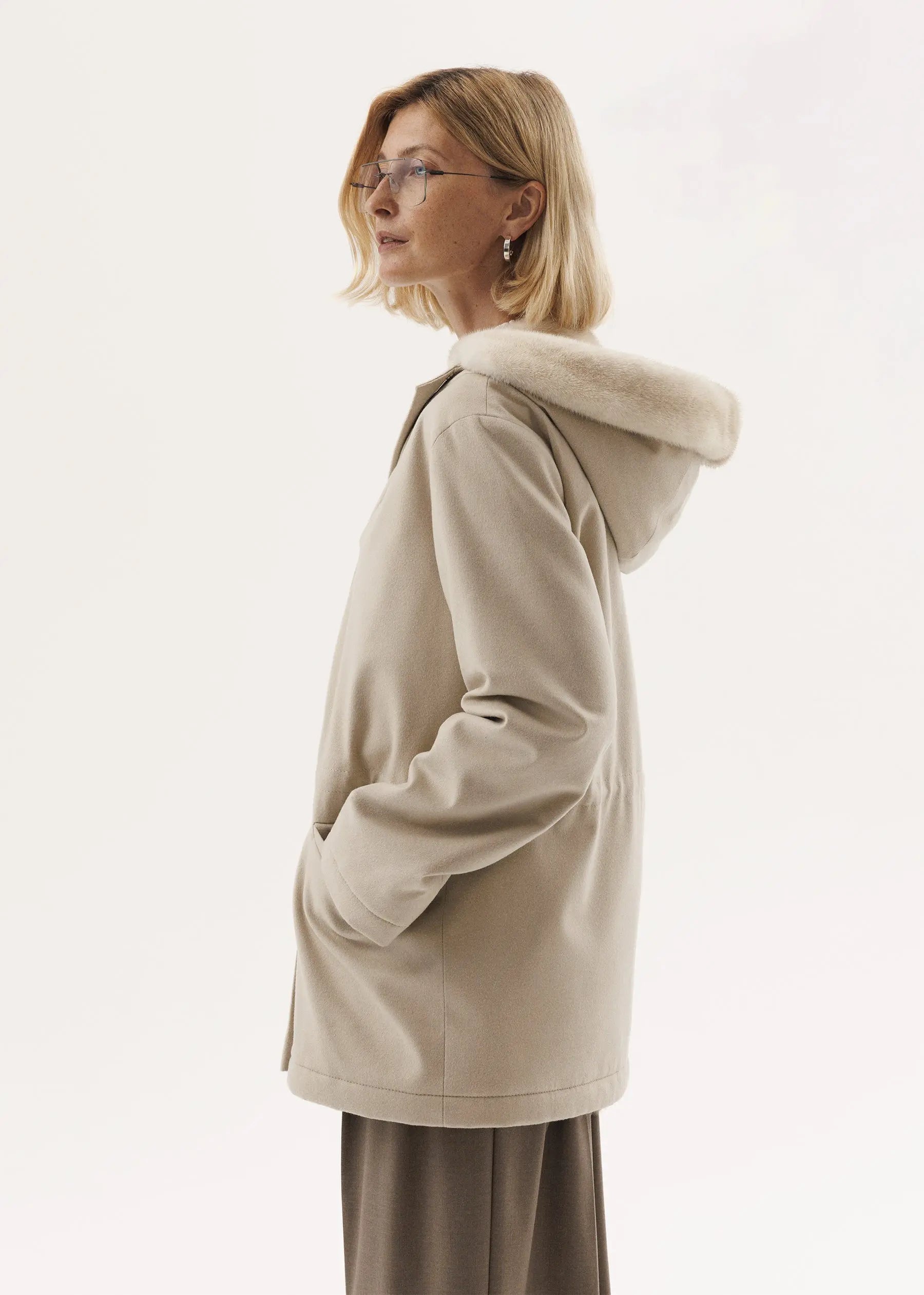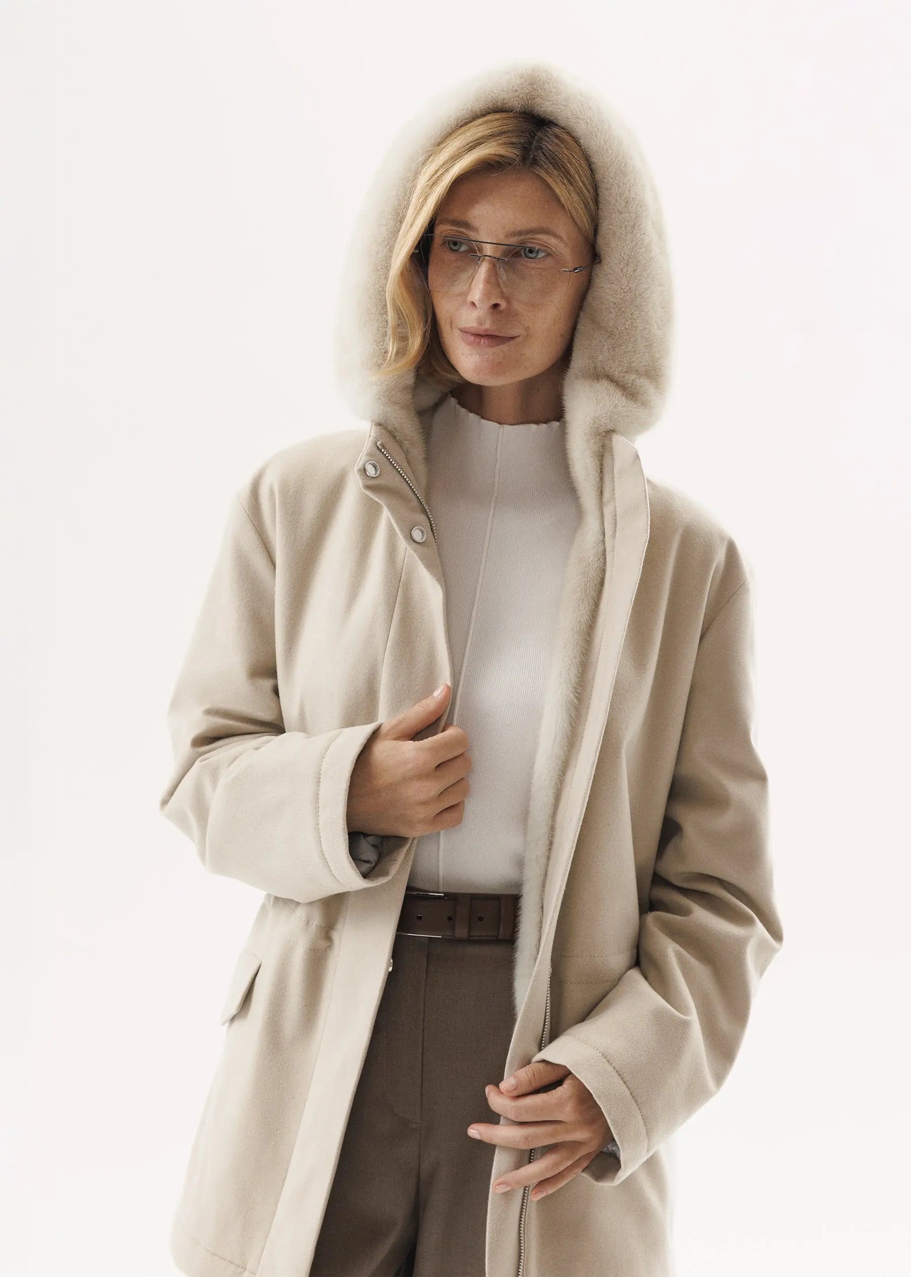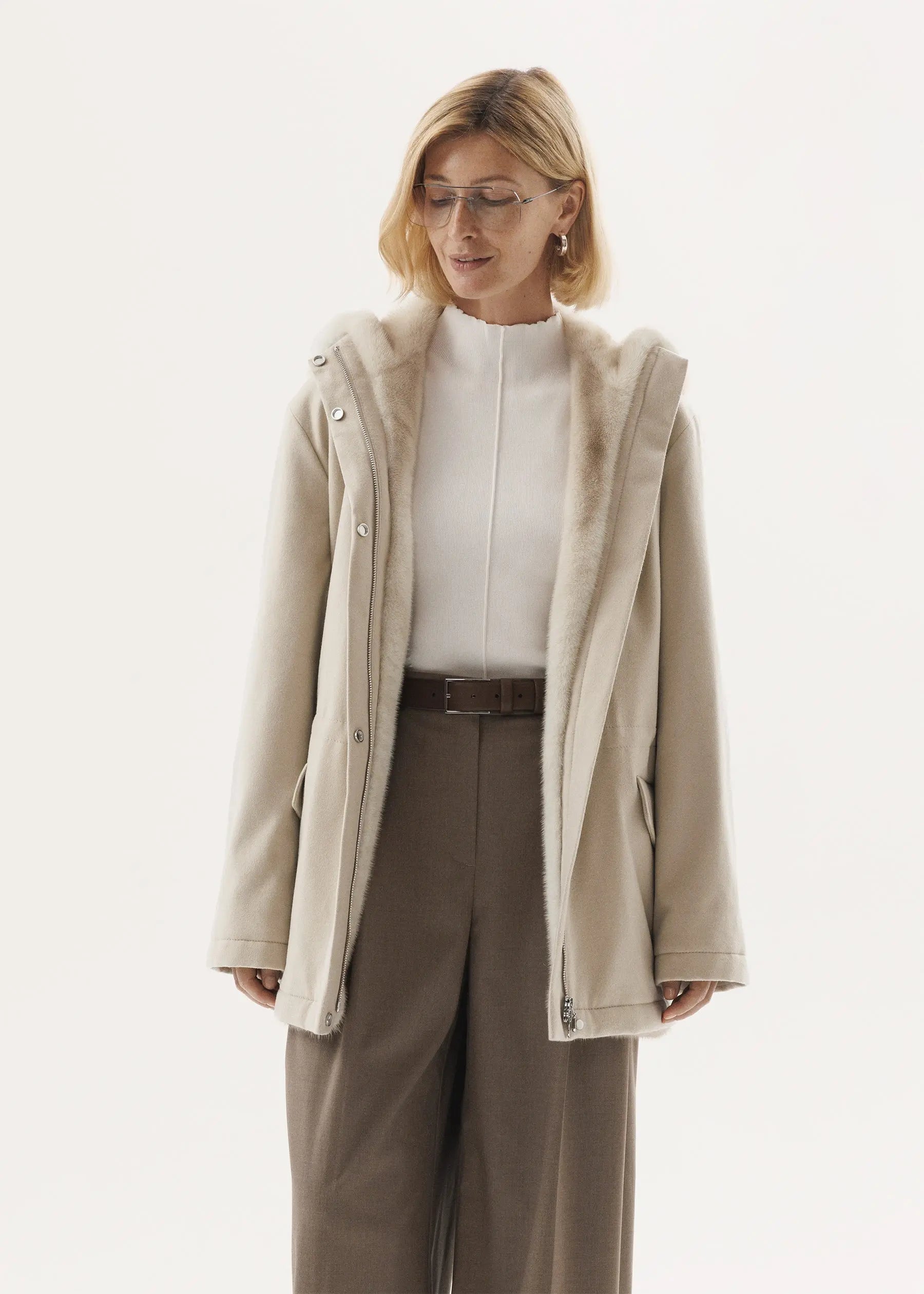 A new interpretation of Furnari's iconic model is a cashmere parka in milky color with a short-haired mink fur lining.