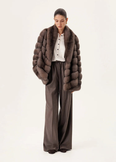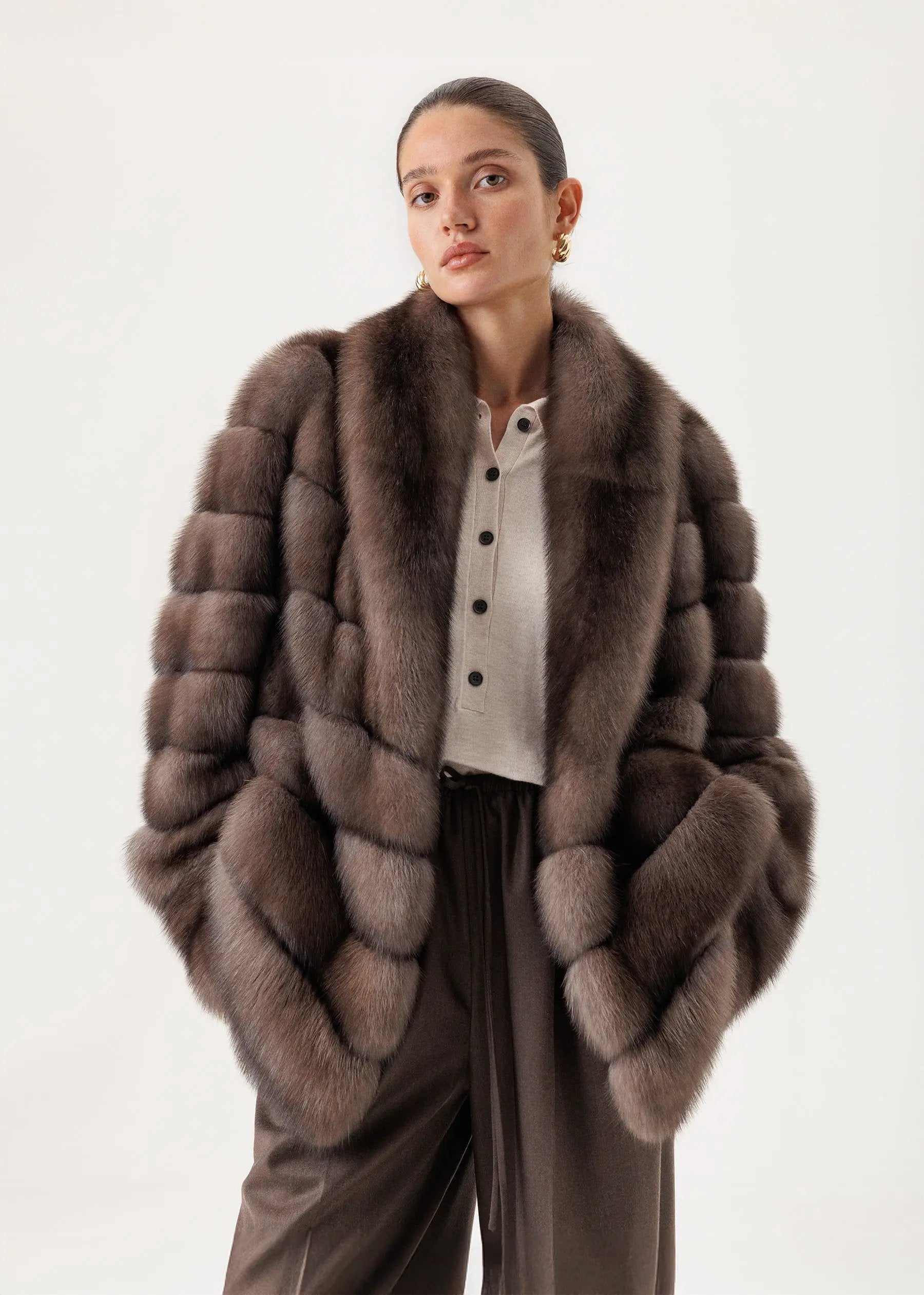 A shortened sable fur coat with diagonally arranged furs will brighten up winter days and add elegance to your wardrobe.