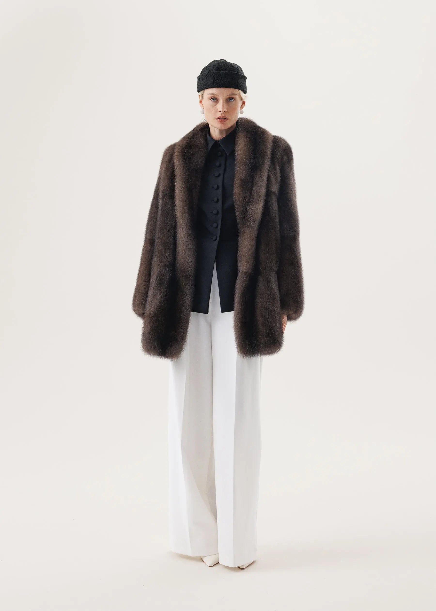 The vertical arrangement of the sable panels creates a clean line and emphasizes the fur's refined texture. The extended shawl collar extends into the coat at the sides, giving it a subtle and luxurious look.
