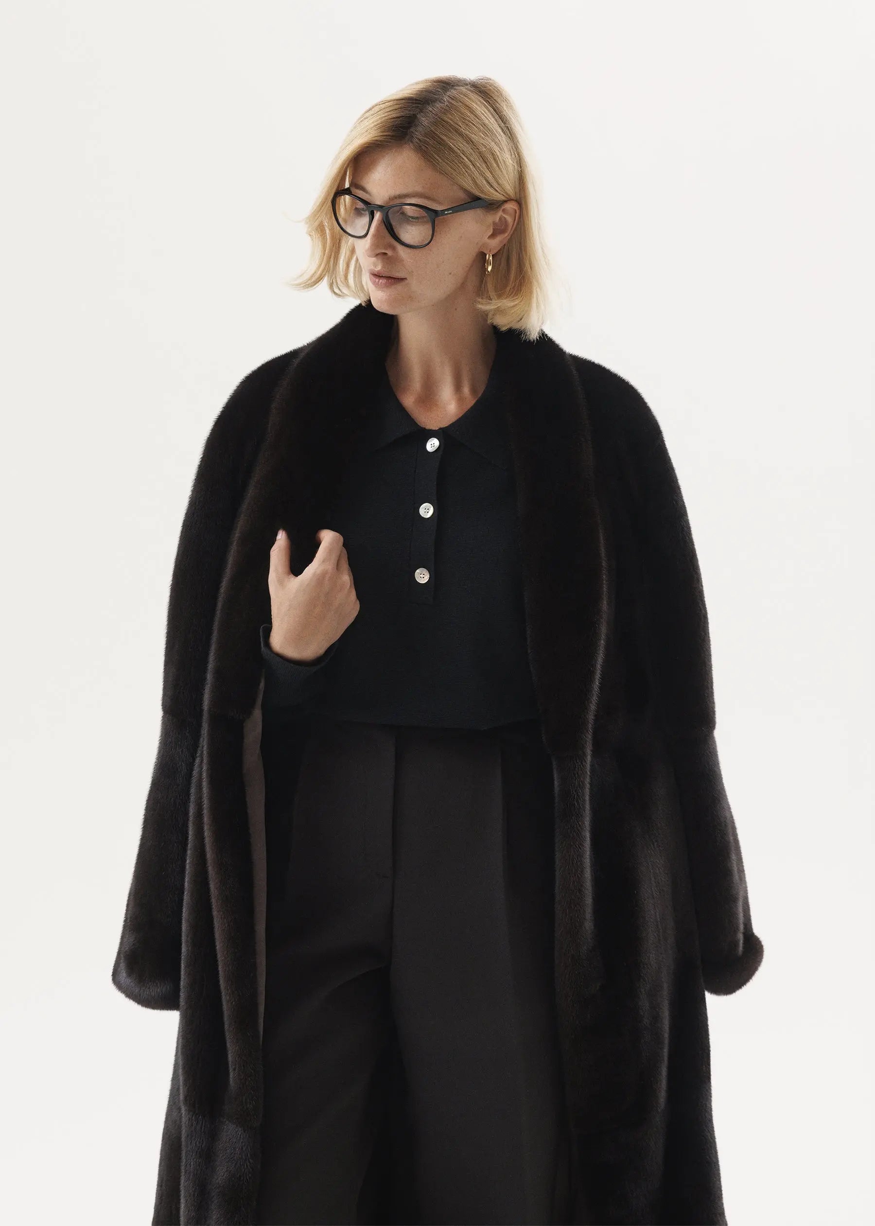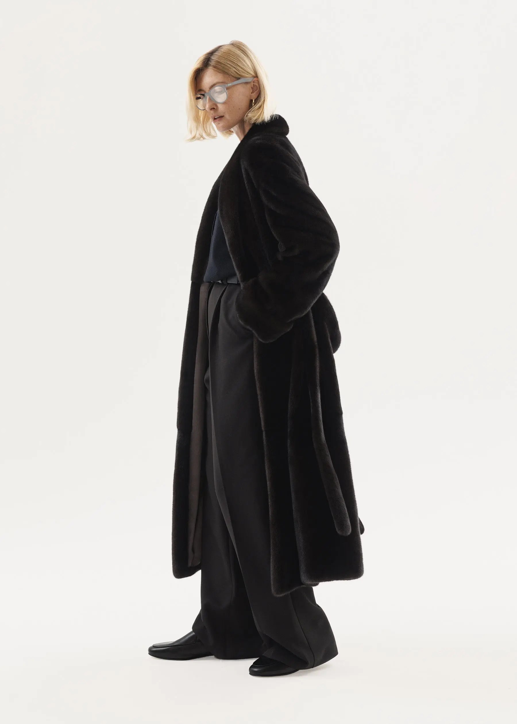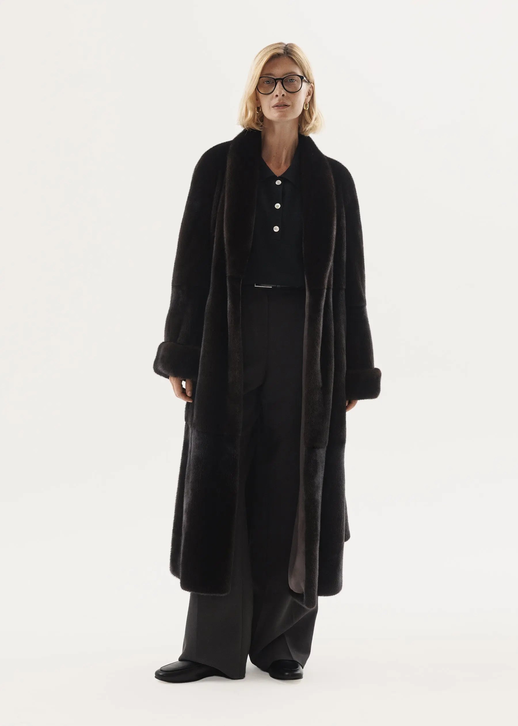 Manteau long en vison réalisé à partir de fourrure de vison à poils courts aux enchères dans un ton réglisse rare qui scintille de reflets noir charbon et couleur noyer selon la lumière.