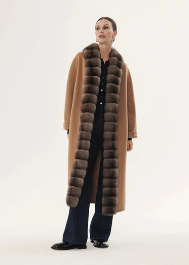 Manteau en cachemire couleur camel avec bordure en fourrure de zibeline