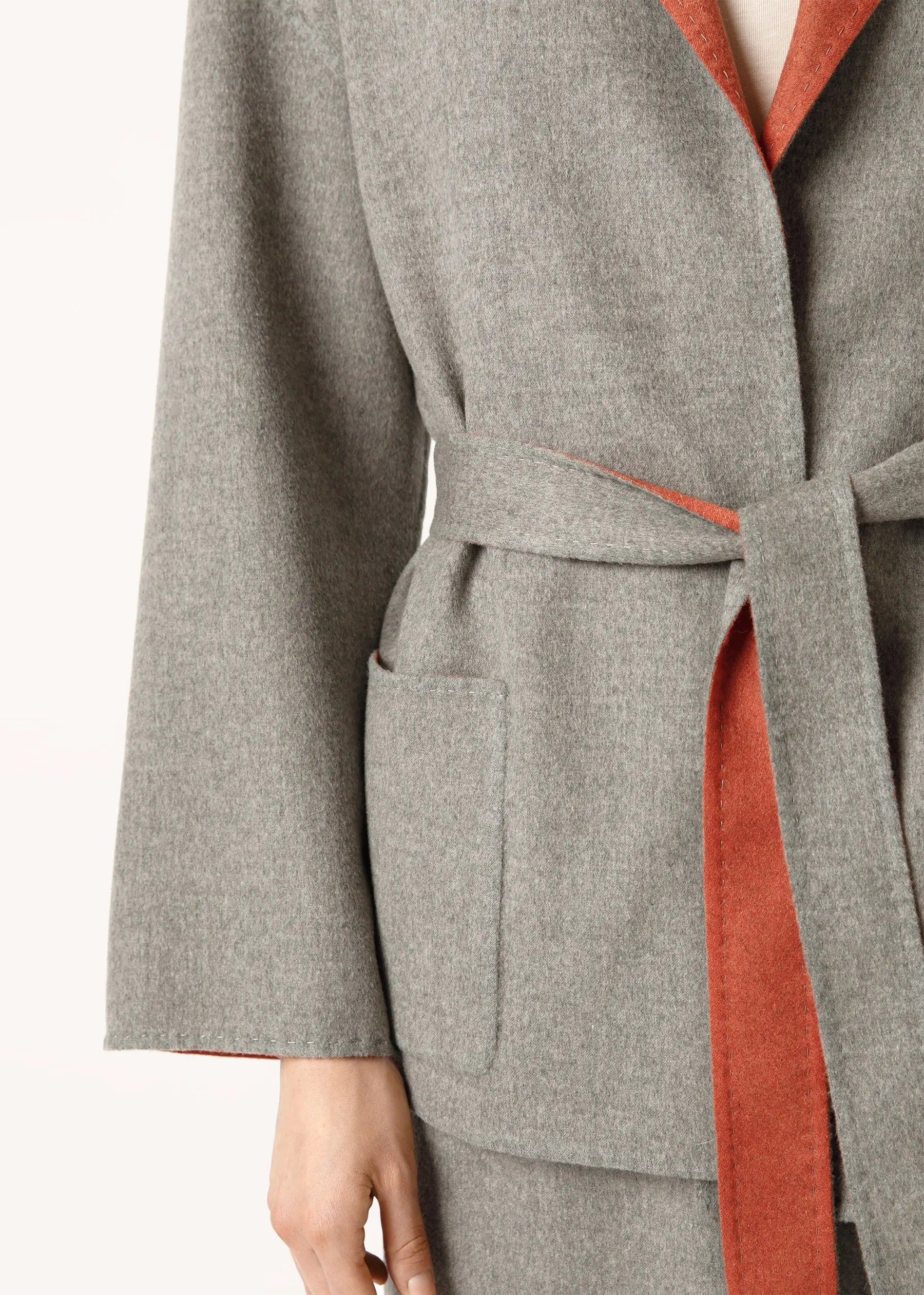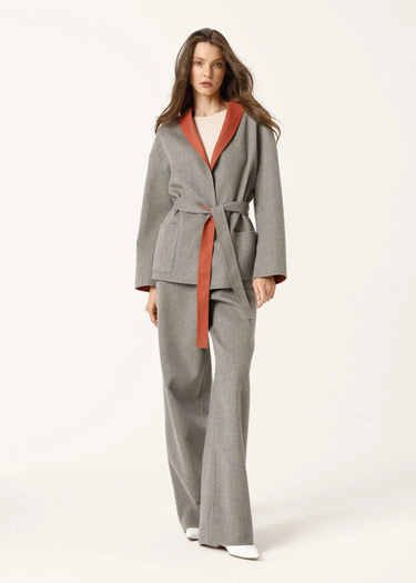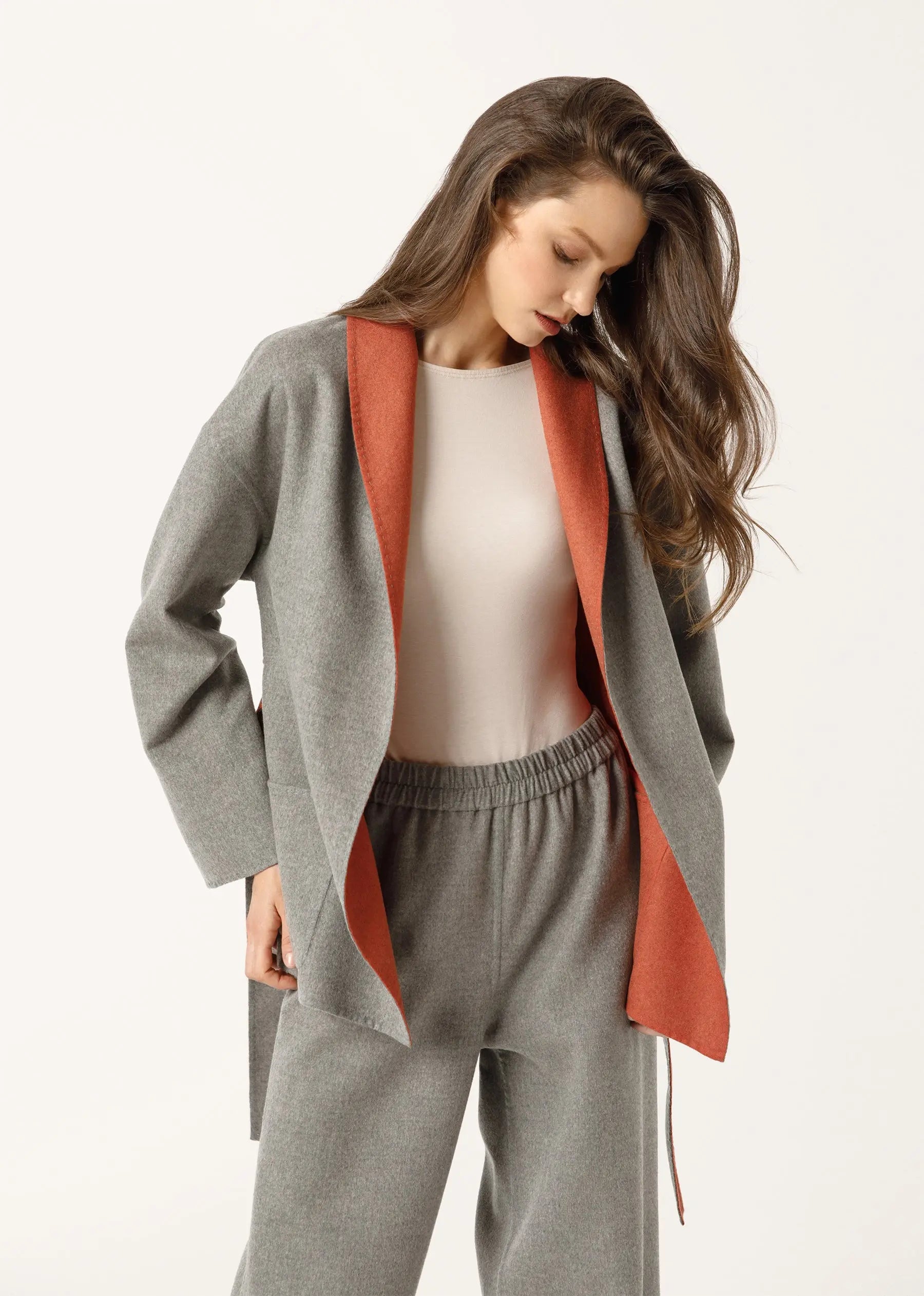 La veste est idéalement complétée par un pantalon en cachemire réversible de couleur similaire.