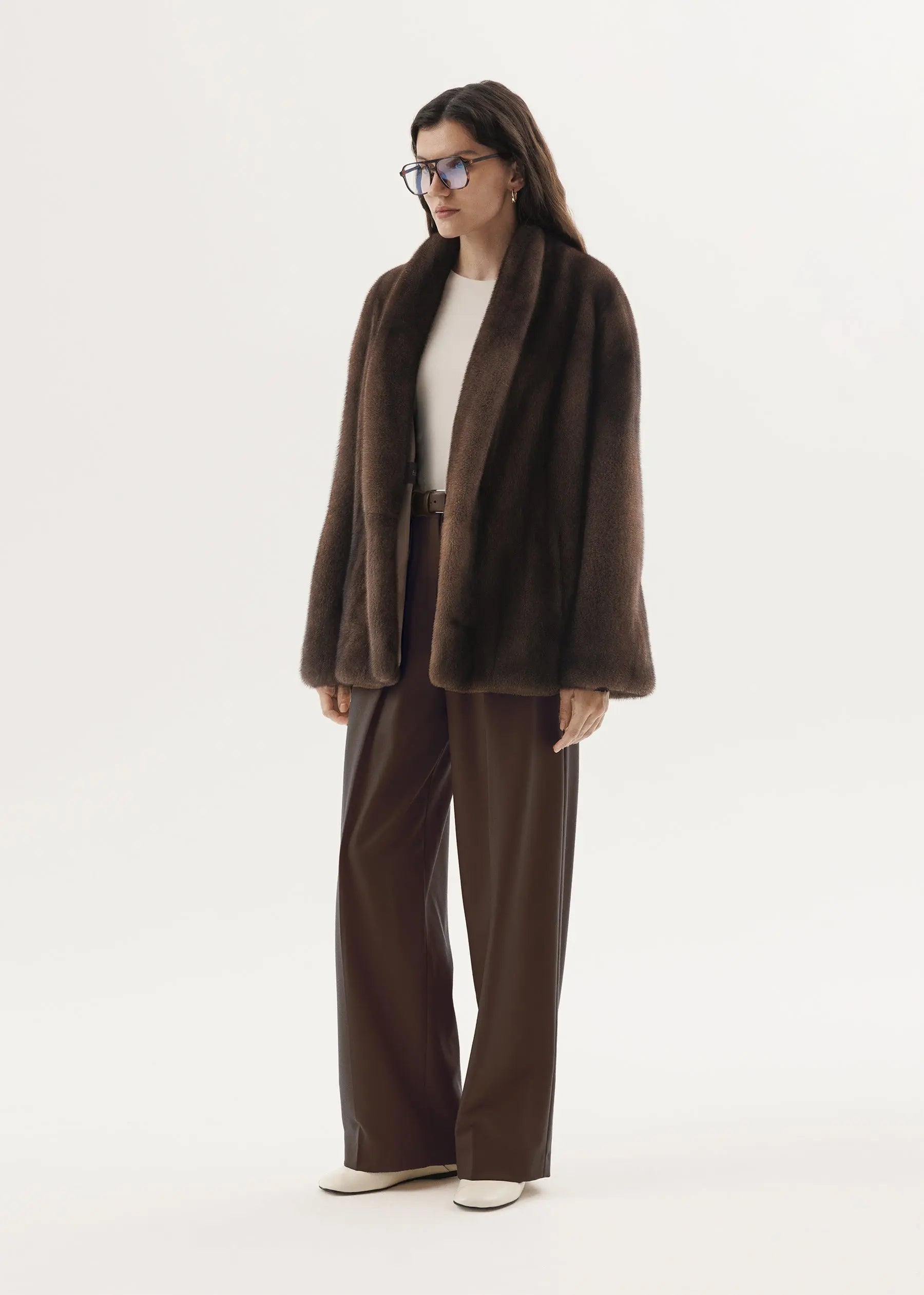 Nouveau modèle de manteau de fourrure en vison des enchères à poils courts. Manteau en vison de couleur noyer classique avec un col châle.