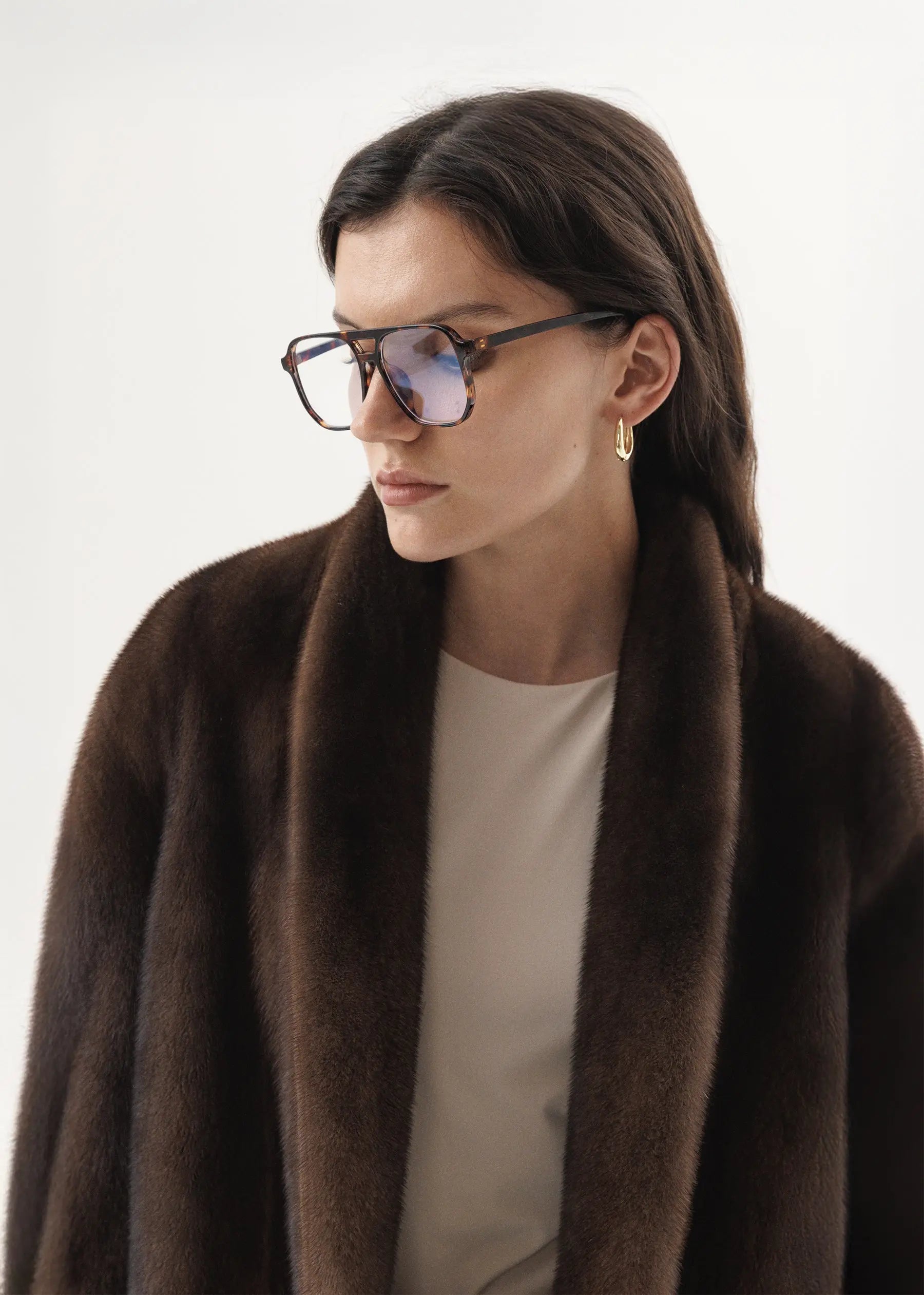 Un manteau de vison similaire est présenté dans des tons caramel doré et noir anthracite.