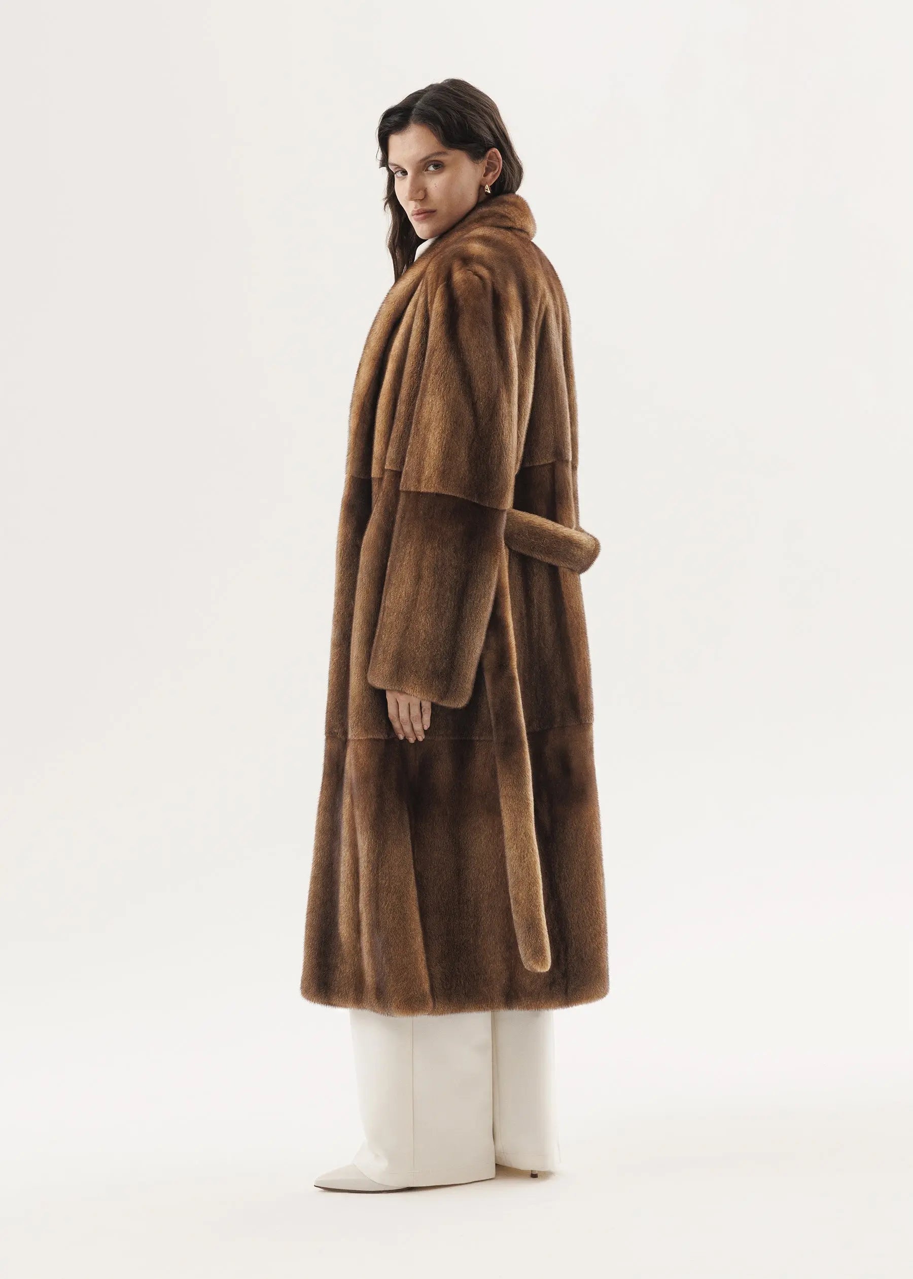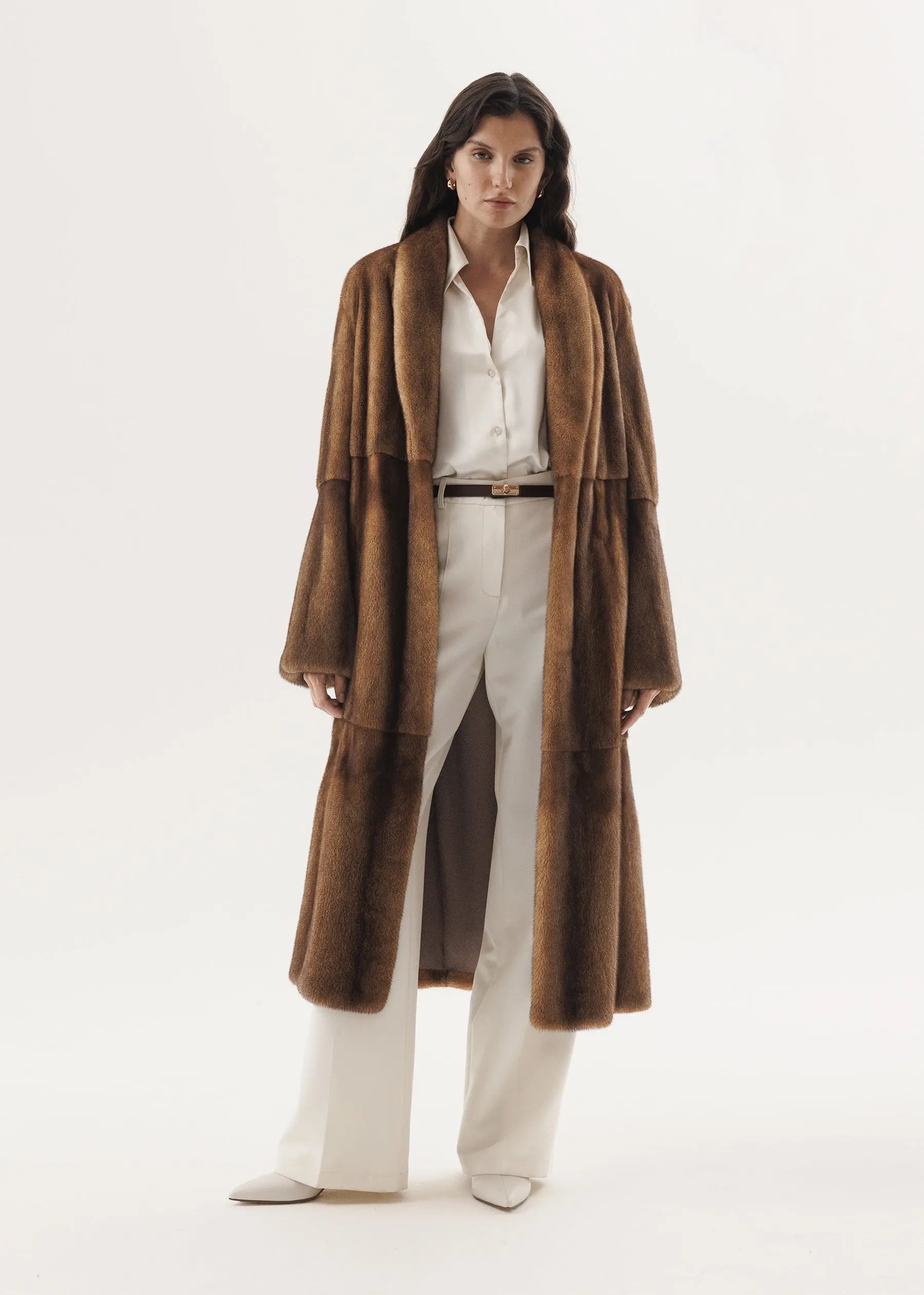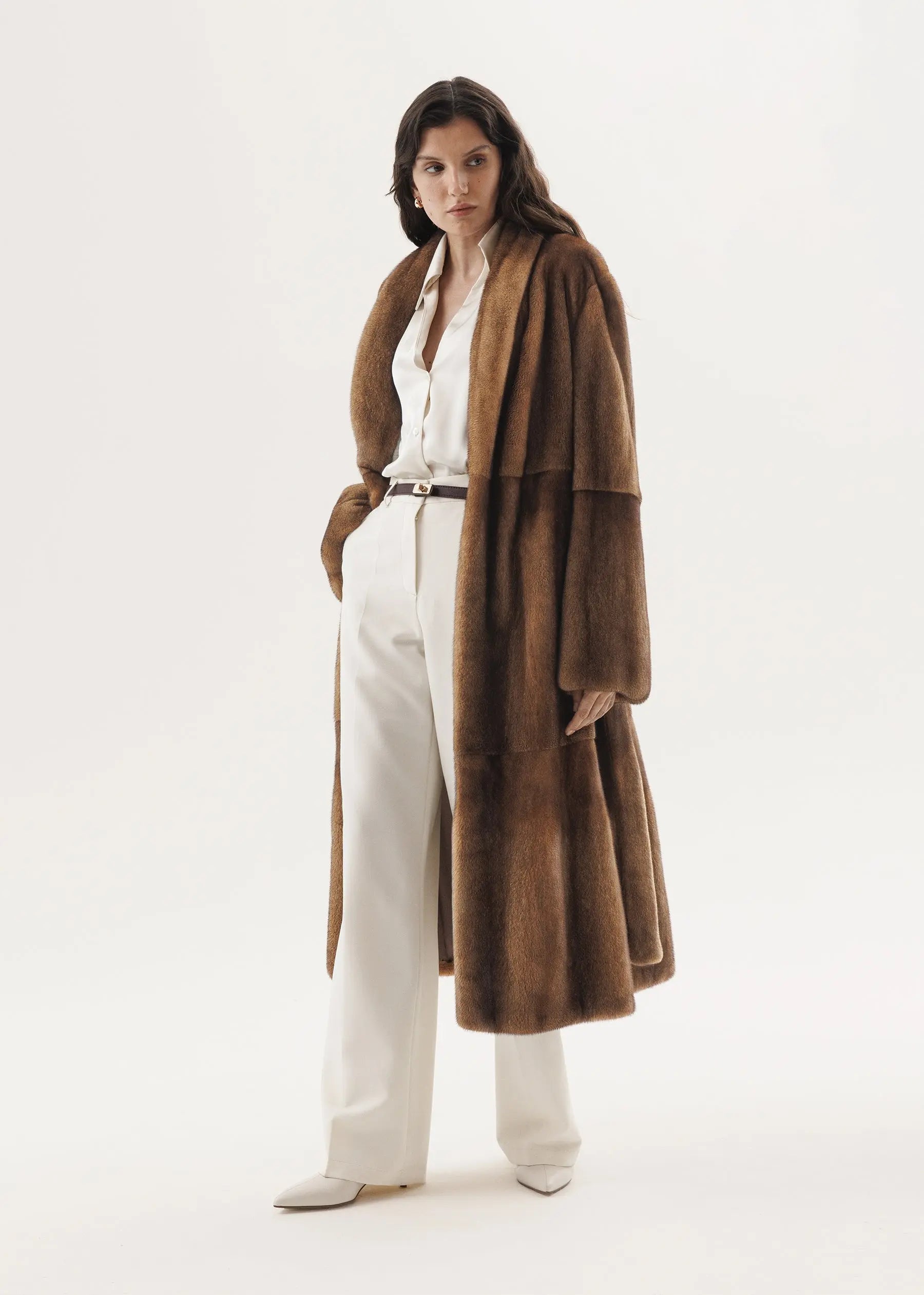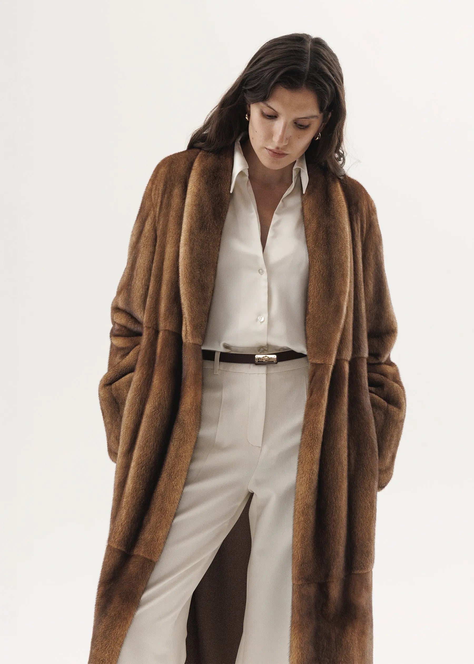 Un manteau de vison similaire est présenté dans une teinte noisette