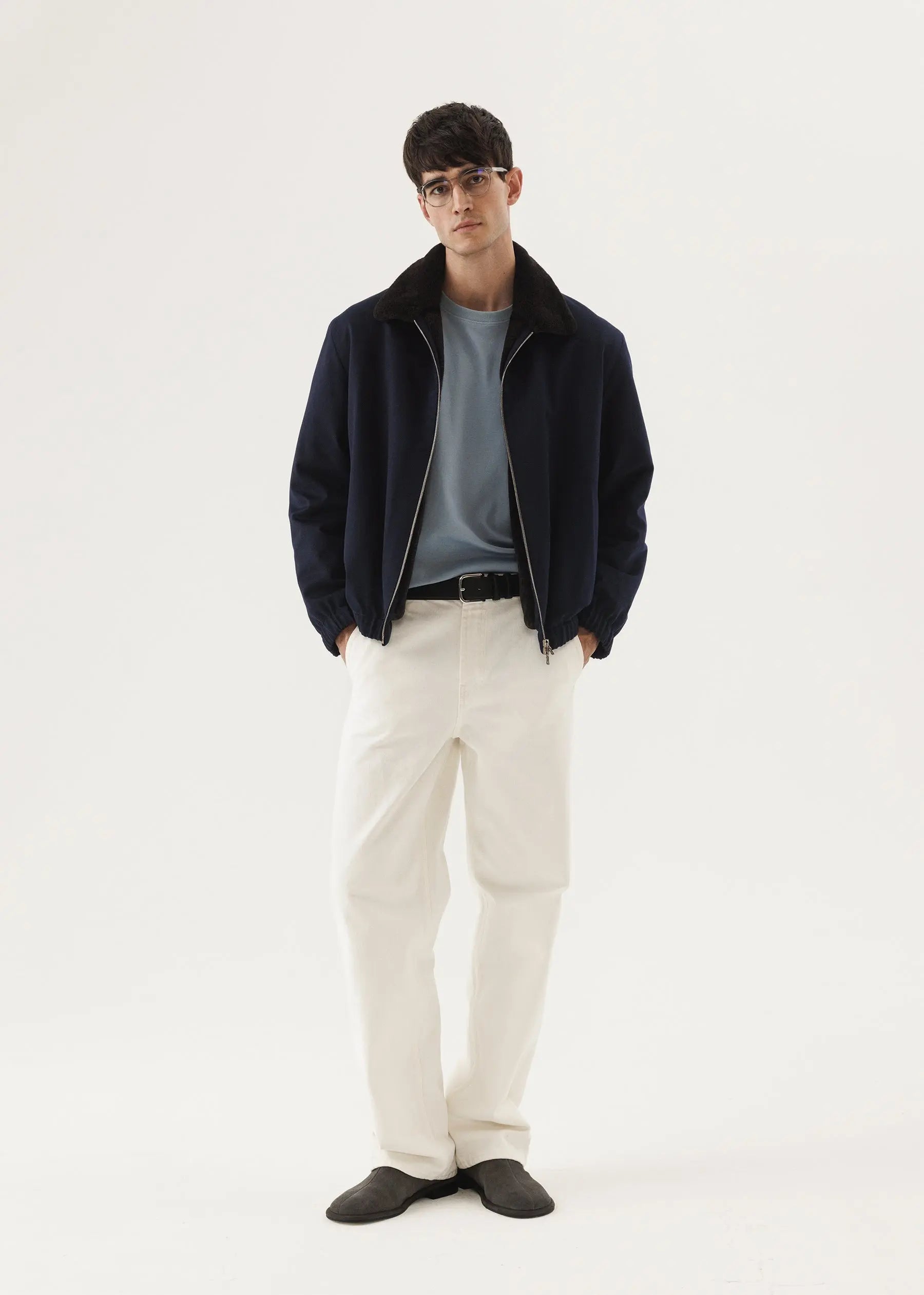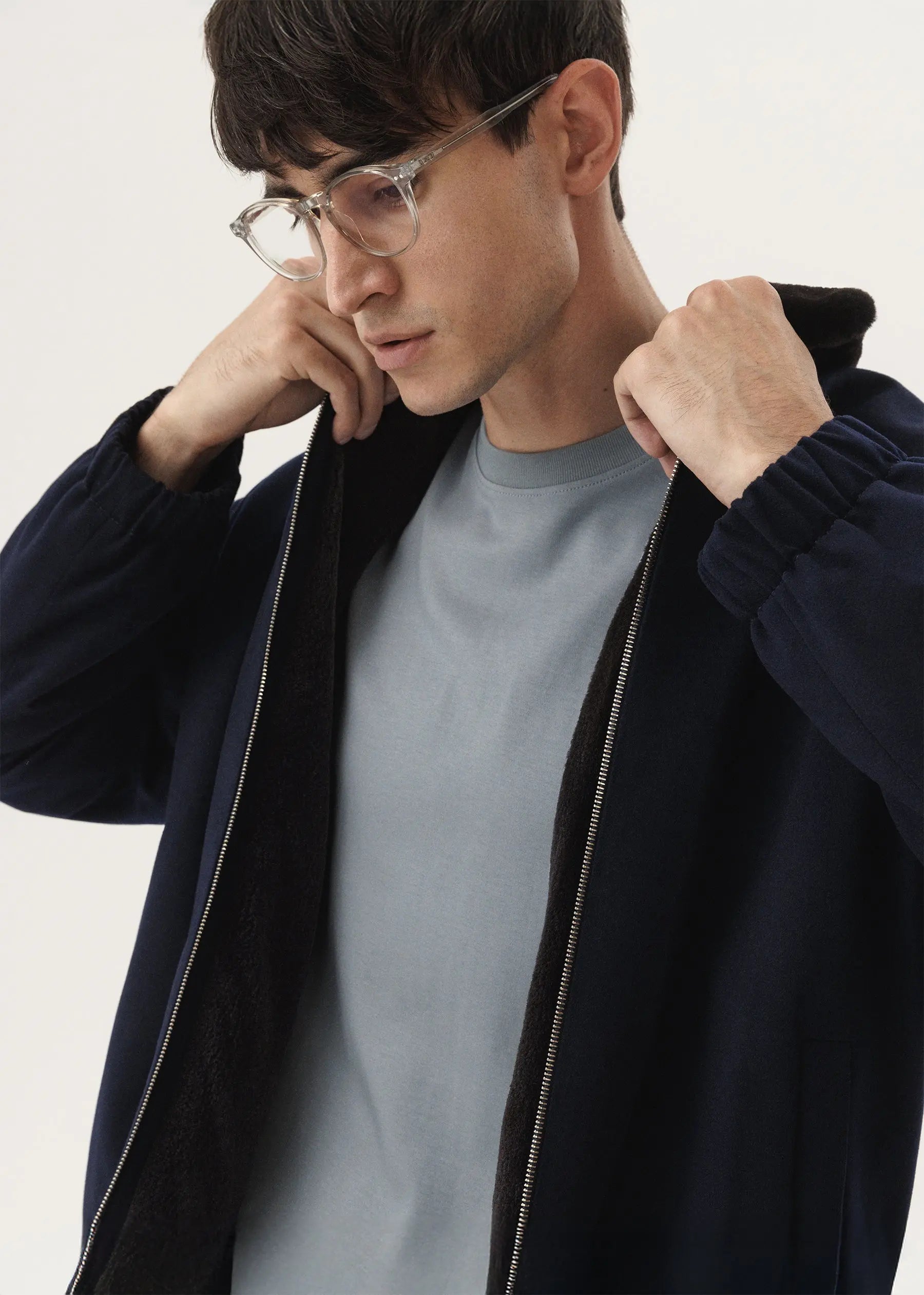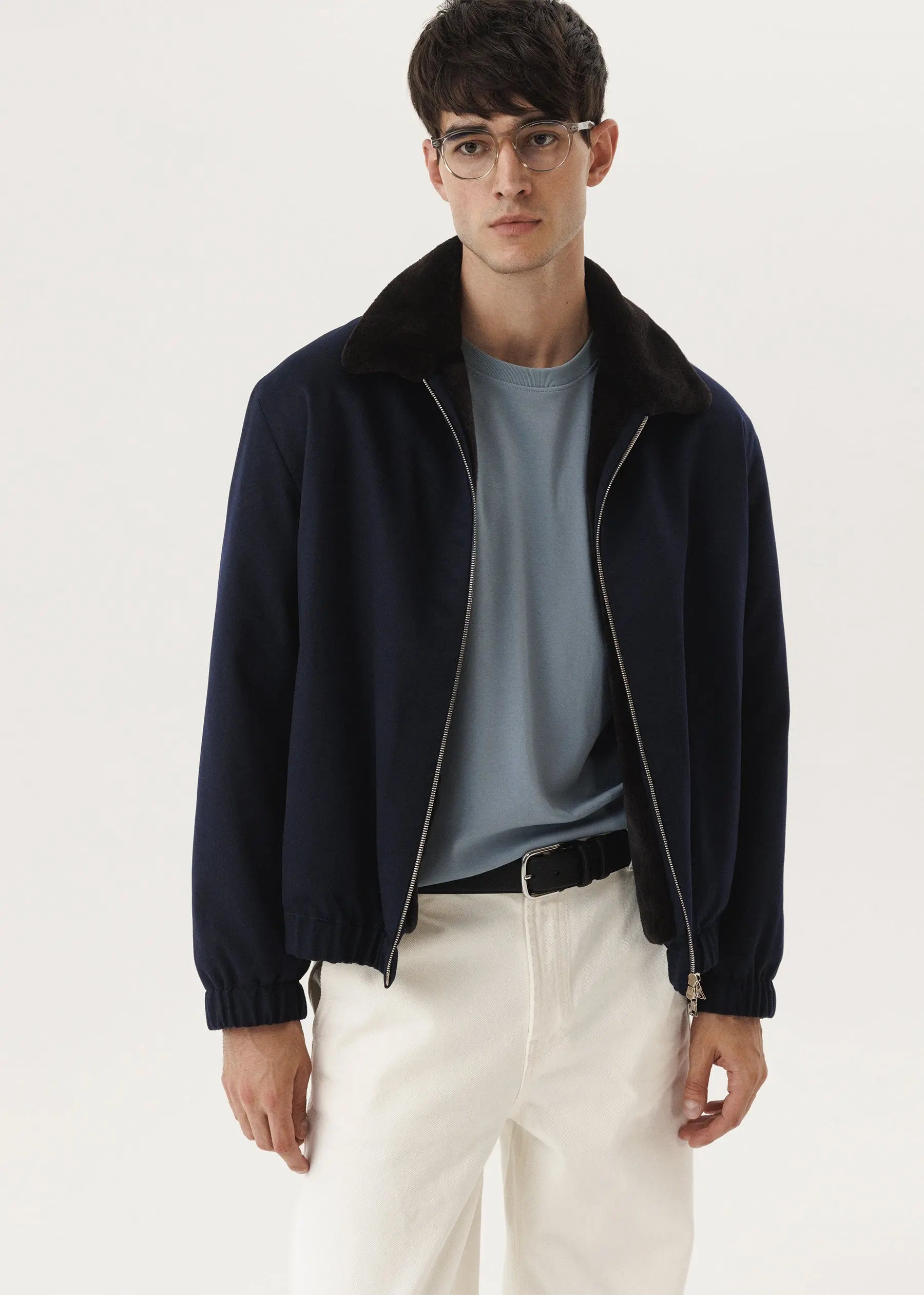Ein klassischer Kaschmir-Bomber in einem tiefen Kobaltton mit einem Pelzmantel aus geschorenem Nerz.