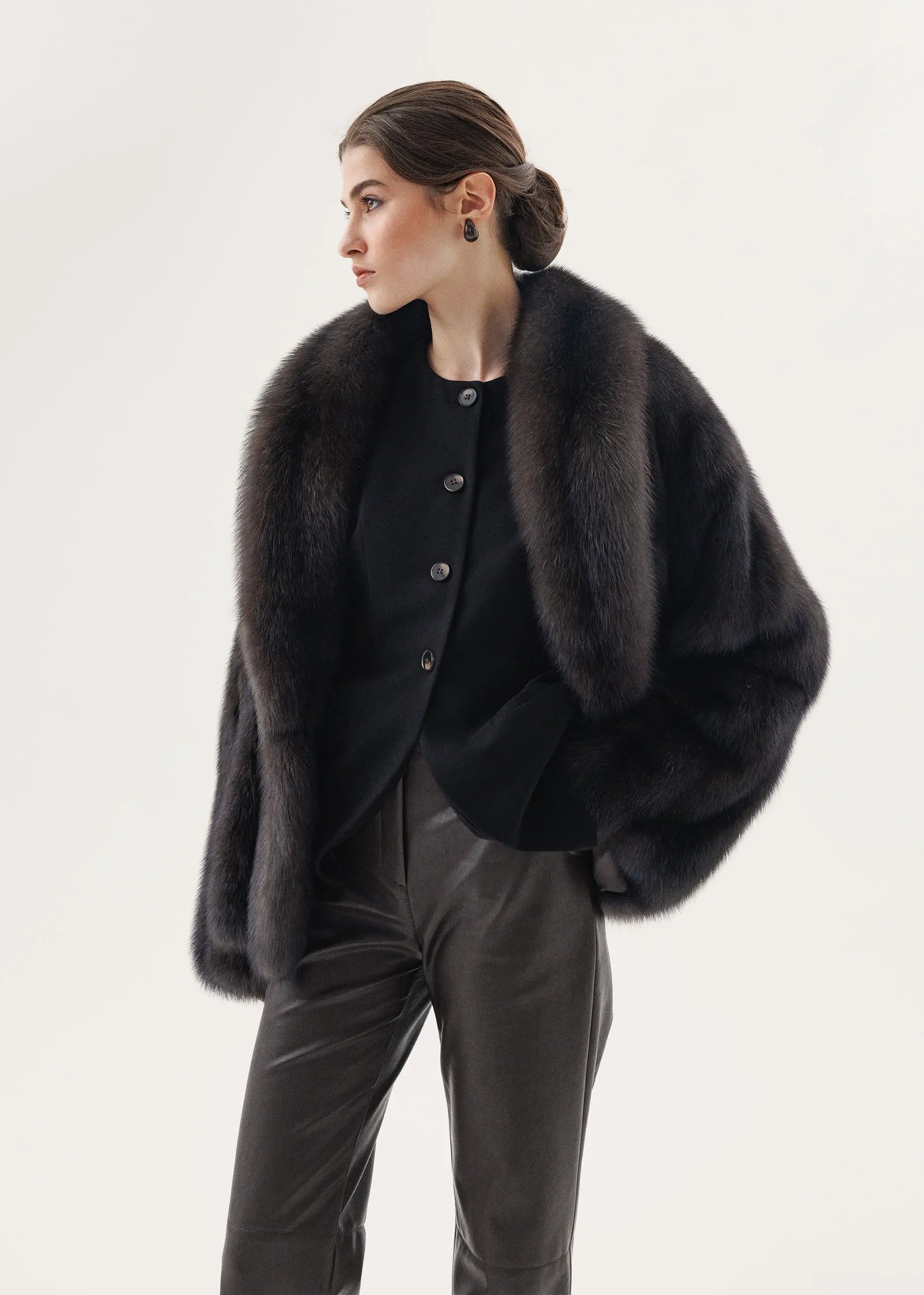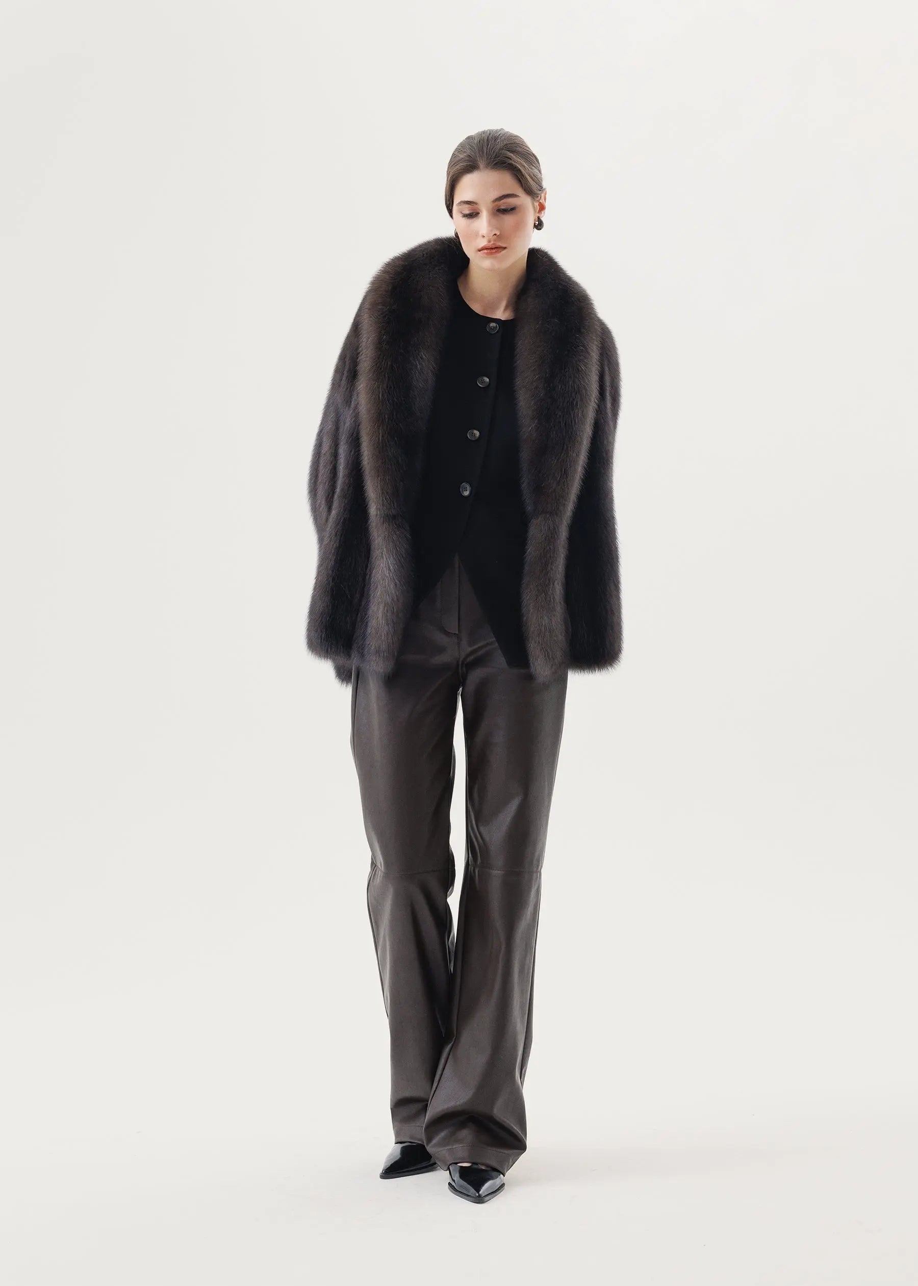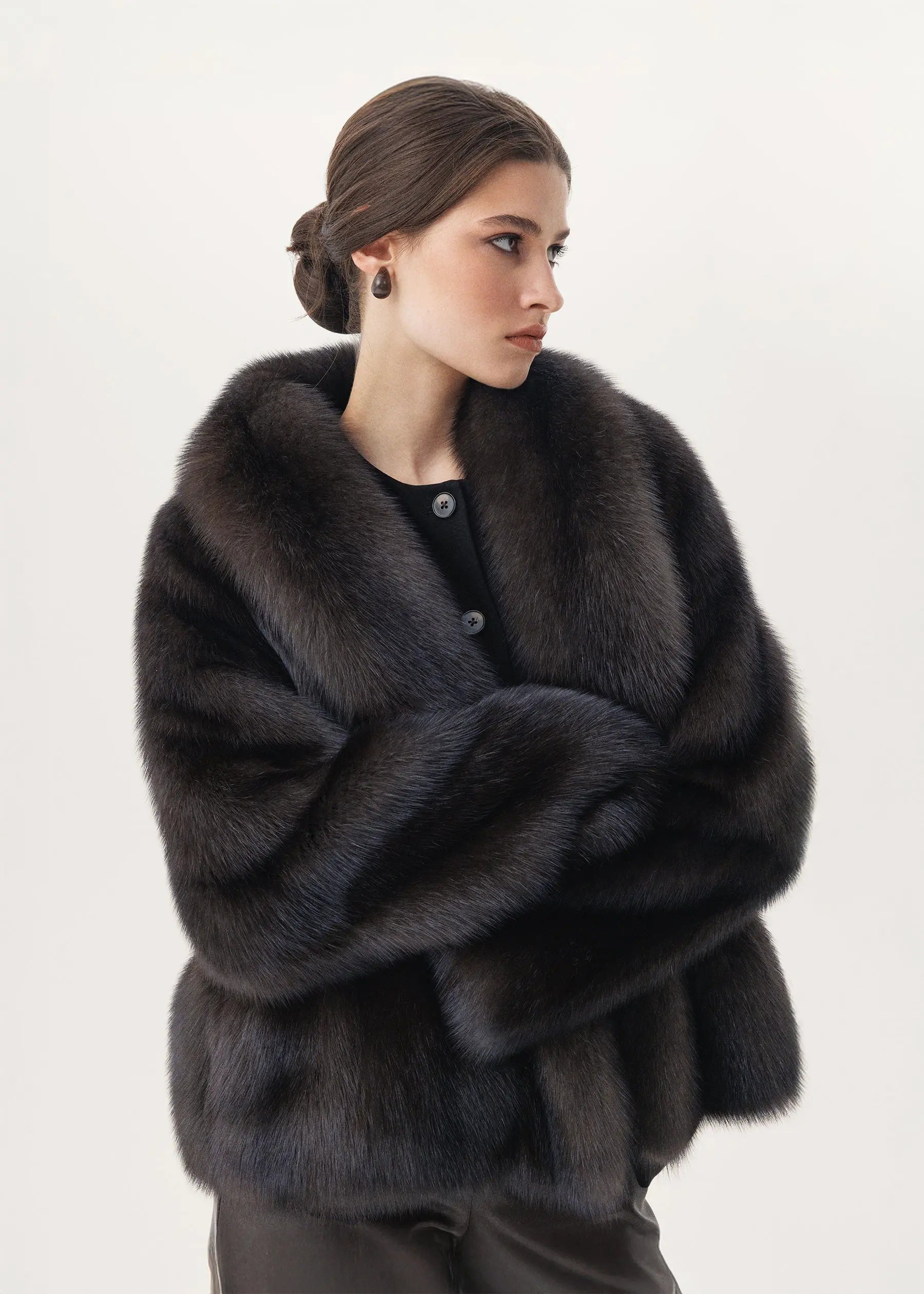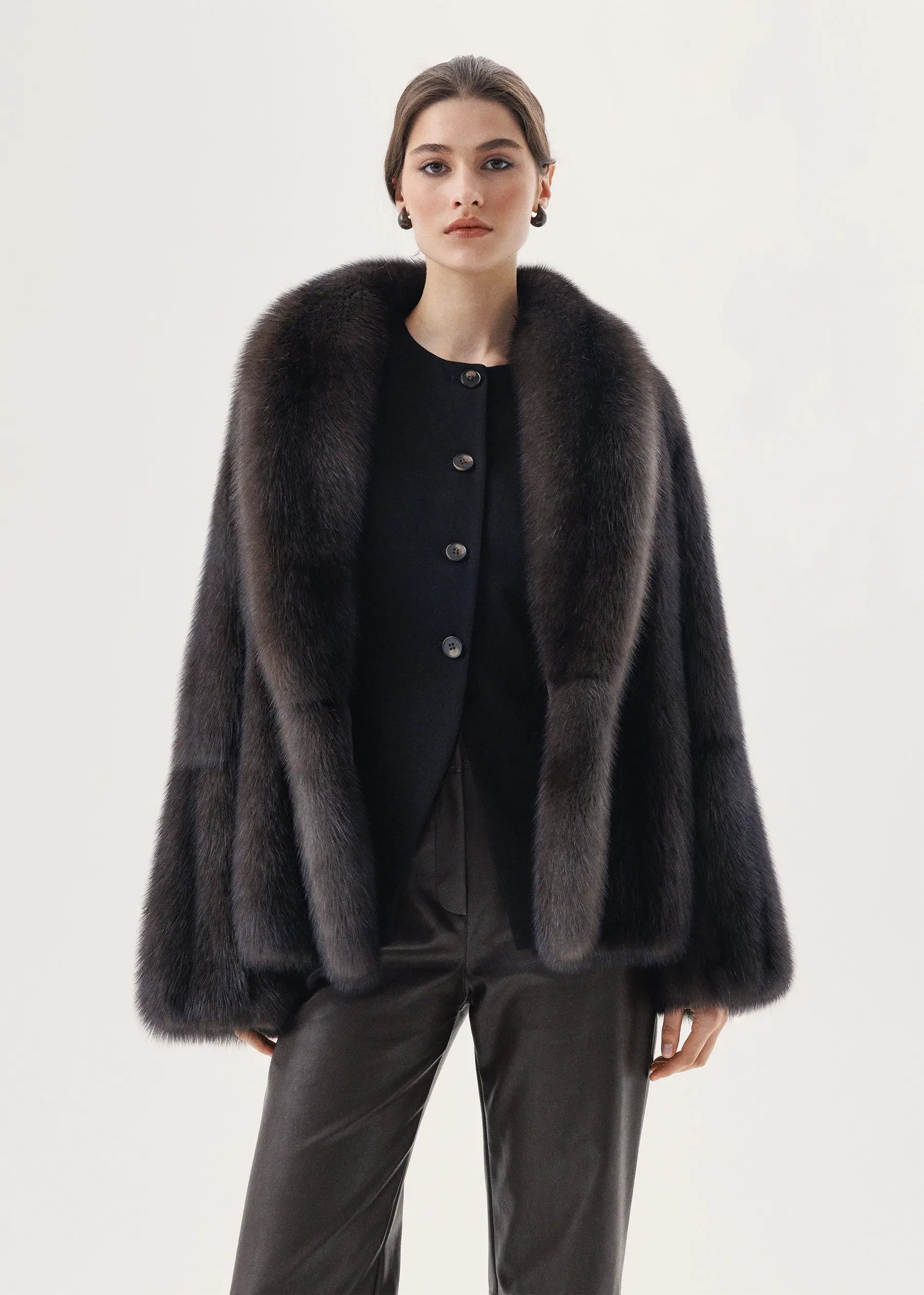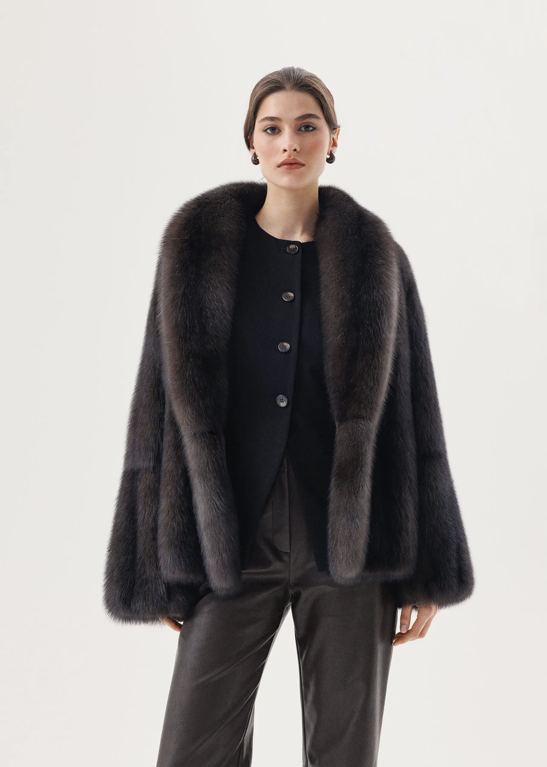 Zobelpelzmantel mit geteiltem Fellarrangement, das die natürliche Schönheit des Fells betont, und ein einteiliger Schalkragen, der dem Look Eleganz verleiht.